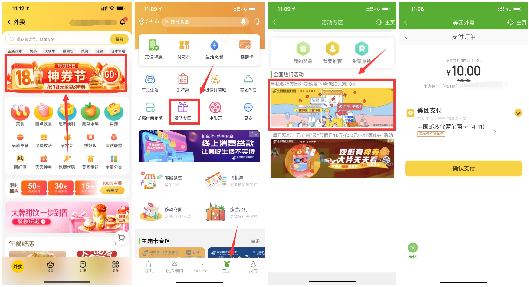 【邮政卡点美团外卖20减10元】美团外卖APP首页“神券节”->今天每个时段可抢38-18元券可叠加!打开邮政银行APP->生活->活动专区->进去后点图片满20元减10元->进去下单20元的->选择邮政卡支付->确认支付订单页面就会显示抵扣->每天名额限量->没了就明天再来->每月可参加两次!