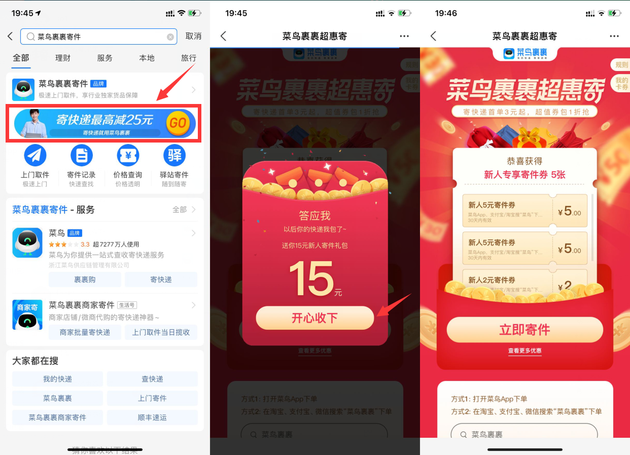 【免费领2~15元菜鸟寄件券】打开支付宝搜索“菜鸟裹裹寄件”->如图点横幅进去领取->近期寄快递可以领上省点!