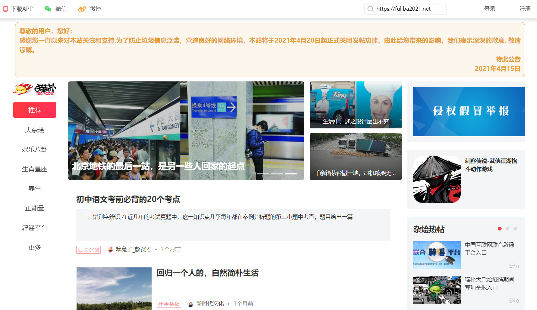 2021年4月15日“猫扑网”发布公告,宣布关闭发帖功能,网站名存实亡。