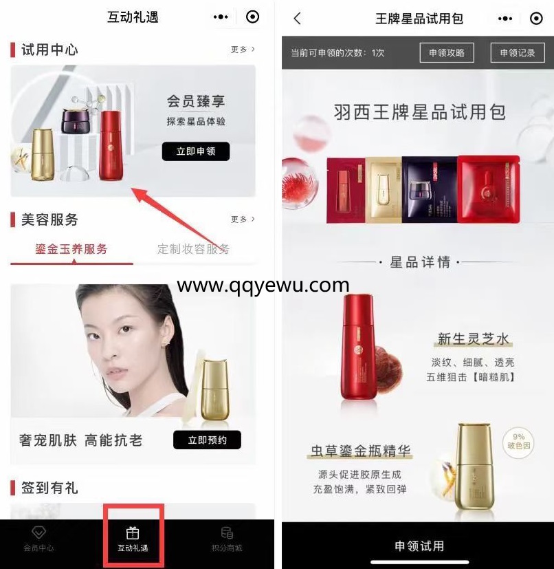 免费申领羽西王牌星品试用包 需专柜领取,进入小程序点底部【互动礼遇】顶部立即申领,含:灵芝水2ml+鎏金瓶2ml+人参眼霜2ml+红晶灵1ml。凭申领成功的卡券到柜台领取。