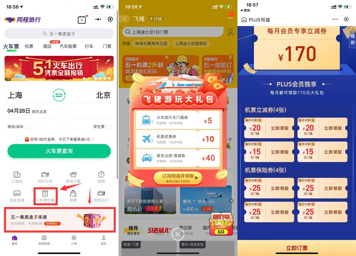 【五一出行火车机票优惠汇总】整理了近期同程旅行和飞猪旅行等火车票和飞机票优惠活动,最近需要买票出行可以看看!
