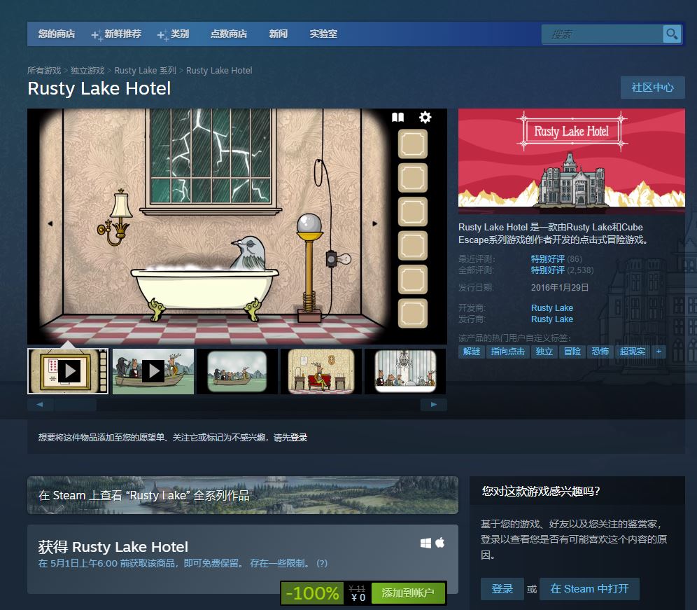 领取地址:https://store.steampowered.com/app/435120/Rusty_Lake_Hotel/