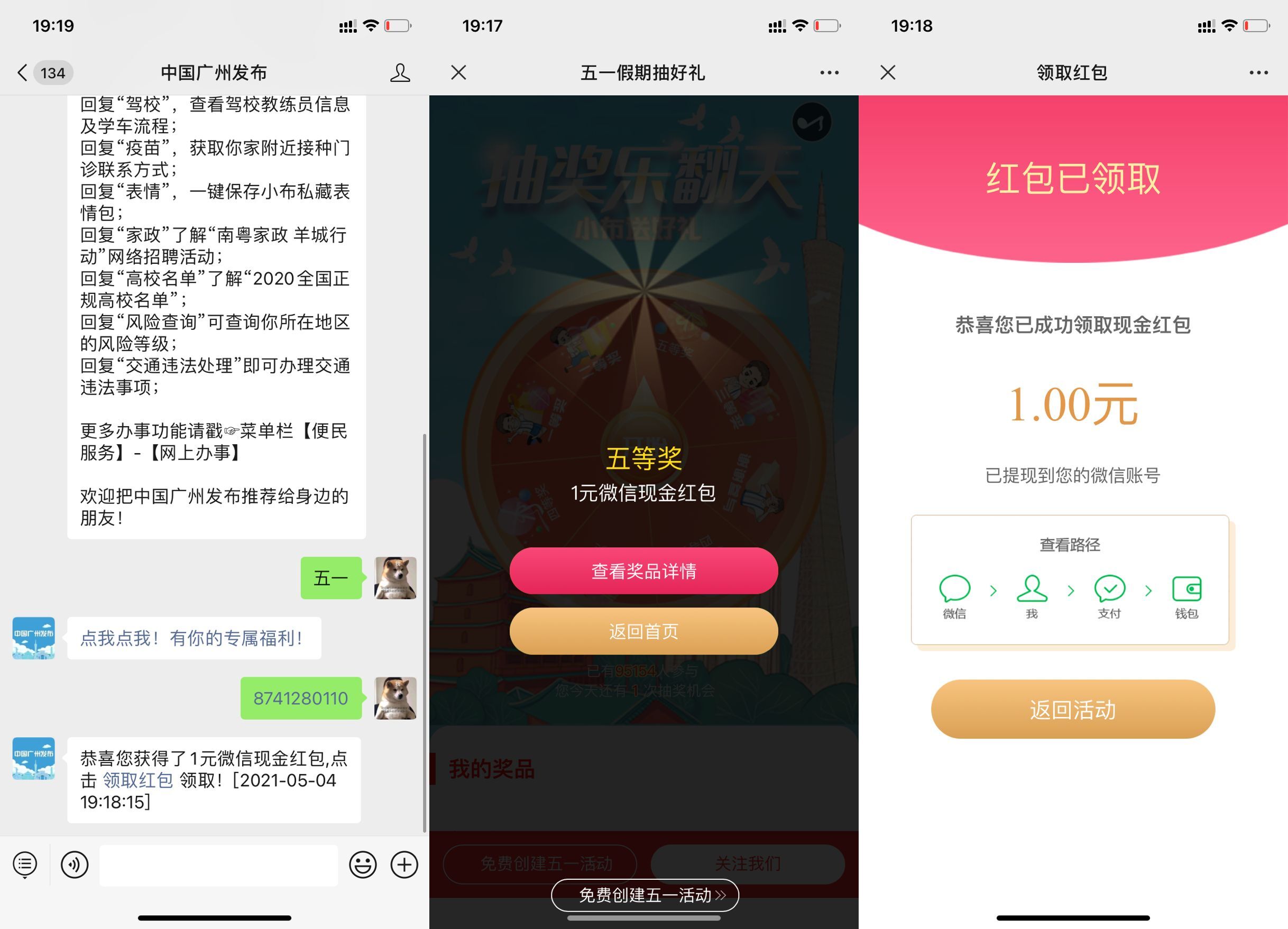 微信关注"中国广州发布"公众号->发送”五一“关键字->点推文进入直接抽->非必中!中的话直接跟着走!亲测中1元微信红包。