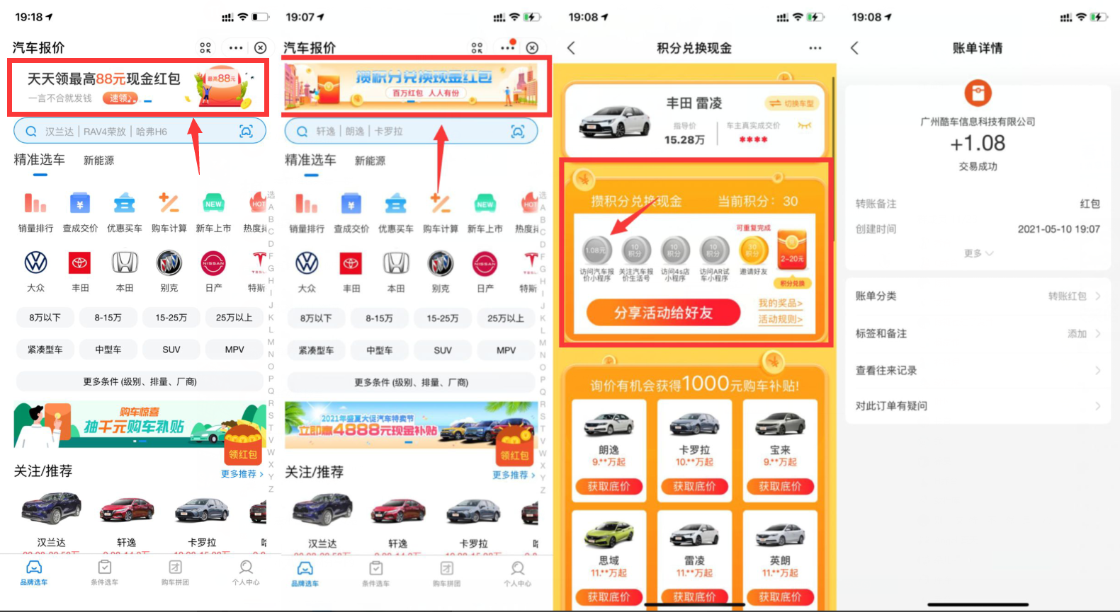 支付宝搜索“汽车报价”->进去如图点这两个滚动栏进入活动->点那个金币红包抽看看中多少 积分还能兑换红包需要蹲点->亲测中1.08元!秒到。