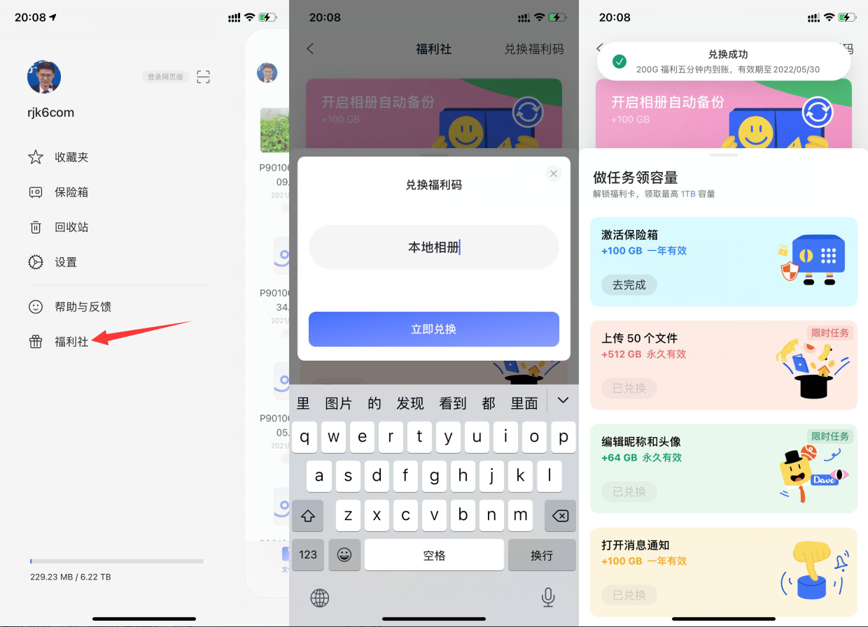 【阿里云盘免费领600G容量】下载阿里云盘APP->登录后点左侧->福利社->兑换福利码->输入“本地相册”“云端相册”“相册升级”->即可获得3个200G容量->有效期一年!