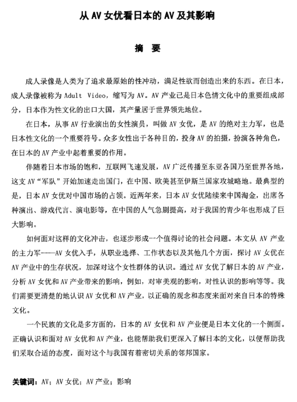 通过AV女优了解日本的AV产业,分析AV女优和AV产业带来的影响,例如,对审美观的影响,对性认识的影响等等。