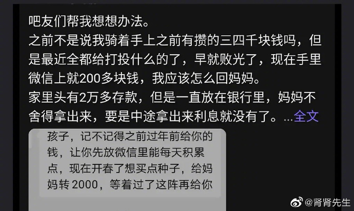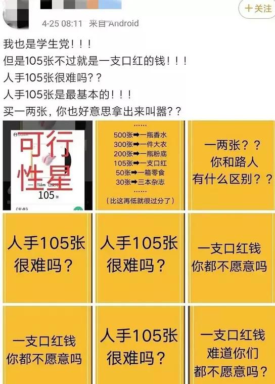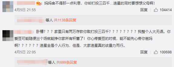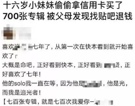 可实际上,网友手里只有200多块,Ta不知道该怎么向妈妈交代。从帖子内容来看,网友的家境不好,父母是靠种田养家的农民。而网友自己,应该是在外上学的孩子。那三四千块钱,可能是Ta未来一段时间的生活费。两万块钱放银行里一年,利息不过300来块,但Ta妈妈舍不得拿出来。而网友却能够将三四千的生活费,大手笔地挥霍一空。这则求助里,与其说网友懊悔的是无法向母亲拿出这么多钱,不如说网友根本没有意识到自己做了错事。Ta担心的,是自己追星事情的败露,不知会遭到父母怎样的惩罚。放眼周遭,越来越多的孩子,在追星这条路上,逐渐疯狂。《半月谈》杂志曾对全国2万多名12岁至18岁的中学生开展过调查,有42.2%的中学生自小学就开始了追星生活,有52%的中学生追星时间在3年以上。在追星和烧钱划等号的今天,这些连生活都无法自足的孩子,钱都从哪儿来?广州市中级人民法院少年家事审判庭庭长陈海仪曾公开表示:
