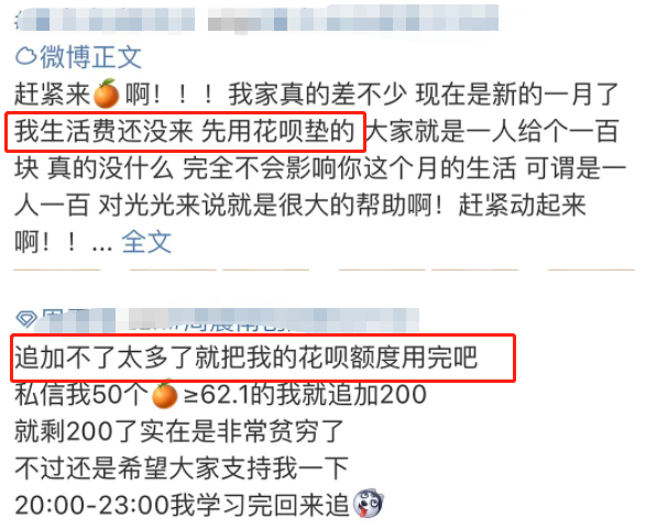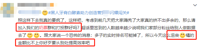 40多岁的母亲,在镜头前频频抹泪,如果不是被女儿逼到绝境,也不会选择曝光自个儿的家庭。她说女儿像是入了邪教一般,脑子里只有明星哥哥,没有丝毫学习的心。会在半夜把已经睡着的她薅起来,逼她转账,买哥哥的新歌,情绪癫狂得令人害怕。一个16岁的姑娘,为了“支持”偶像的新专辑,偷偷拿父母的信用卡刷了700张,还发在微博炫耀。广东东莞一名16岁的男孩小张,为给偶像应援,先后以家人病重、家庭急用钱、股票亏空、亲戚出国等各种理由欺骗网友转账90多万。还有医生网友爆料,15岁女孩找爸爸要5000块钱给偶像氪金未果后,直接吞了100粒药丸,被送到抢救室,确诊药物中毒。另一个女孩子北北,大学毕业后就没有工作,为了追星欠下7.8万的网贷。为了还网贷,她挪用了粉丝生日应援筹集的钱,被其他人发现后报警,北北在出租屋内烧炭自杀。除了这些应援和打榜,他们还会掏钱给节目组或主持人送礼,只为让自家偶像能够在节目上被优待,或是比其他艺人多一些“排面”。还有更多我们看不到的孩子,在花光自己的生活费后,开始透支花呗为偶像集资。集资,简单解释就是先找后援会或应援站这样他们认为有公信力的团体,定下众筹目标,然后粉丝直接把钱打进他们开设的账号,再由团体购买专辑、投票券等为偶像加油造势。为了规避法律风险,他们会用橘子或橘子符号代替“集资”这个词。有的孩子,自己已经没钱了,还要拉着别人一起为偶像买单。一句“你这个月没钱了先透支一下,xx的人生之路可等不到下个月”,就可以煽动大批追星党继续打投。一边透支自己、吸家里的血,一边为爱不间断地砸钱发电。父母卑躬屈膝辛辛苦苦赚来的血汗钱,在子女的嘴巴里不值一提。我知道,又有人要拿“一个愿打一个愿挨”的说辞来混淆视听,那是因为,你不知道那些在背后怂恿着这些“学生粉”的人,套路有多深。用媒体评论来说,所谓选秀和打投,实际上是一场多方合谋的对粉丝的围猎。2019年,一个学生粉控诉,她为喜欢的歌手做应援集资花光了钱,平时只吃馒头榨菜,用光了花呗,舍不得买新衣服。只因为没钱停止应援,就遭遇了群内的其他歌迷阴阳怪气的网暴。更有脱粉的粉丝直言,饭圈文化,就是一场大型PUA。大粉(粉头)发布任务,学生粉执行任务,是最基本的操作套路。以近几年夏天大火的《创造营》和《青春有你》系列选秀综艺为例,节目为选手集资的手段是要粉丝买赞助商的乳饮料。因为一箱乳饮料会有额外的投票权,买得越多,投得越多,统称为“奶票”。媒体采访了一个为《创造营2020》选手打投的女孩萌萌,她一次性买了50箱奶: