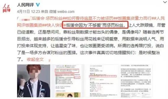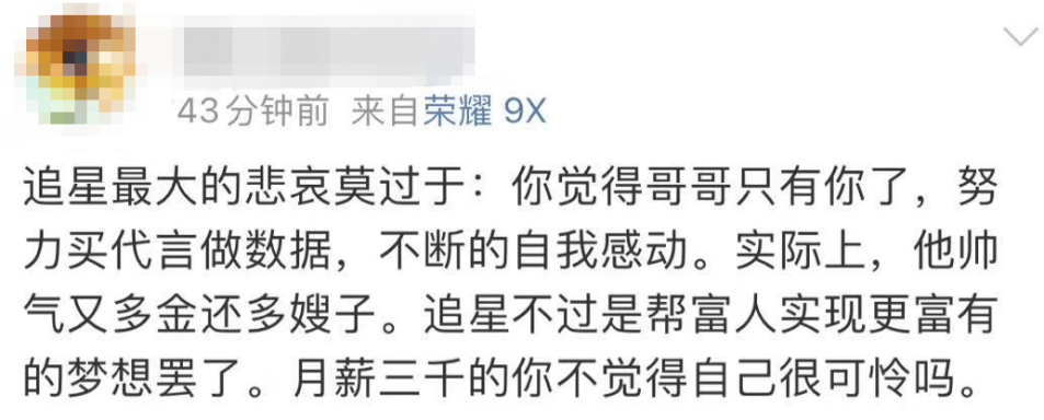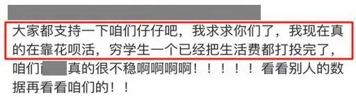如果连买奶票这种小活都撑不起,圈里人就会用各种PUA言论进行道德绑架:“C位不是靠嘴来说的,拿出你们的行动来!点击下方打钱链接。”“哥哥就只有我们了,如果我们不加把劲,哥哥还会有明天吗?”“一杯奶茶钱你都舍不得花,还怎么好意思开口说爱?”当这种声音萦绕在为偶像发狂的学生粉耳边,冲动之下,又会有多少孩子掉进资本的漩涡?如果这都不能刺激你为爱发电,那明星公司也会在暗地里下场,和后援会联手,找对家偶像PK,再宣传造势:你要看自己喜欢的人被你讨厌的人比下去吗?这一番操作下来,再没有任何小粉丝能够逃得过掏钱的命运。在你上供了钱包,出卖了苦力,费尽心思打了榜,而你的正主却还是没有达到预期成绩时,后援会还会列出一系列惩罚。以爱之名,沦为利益链上最底端的“劳工”和“钱袋子”,现在,还要因为“不够爱”而被罚,简直可笑。有媒体形容道,他们每天夜以继日地打投、反黑、控评、做数据,比互联网公司996还劳心劳力;他们省下饭钱,为爱豆买杂志冲销量,集资送礼撑场面,简直就是免费的“人形提款机”。可是用父母挣来的血汗钱,为一个陌生人铺垫了真金白银的康庄大道,图什么?当他们大手笔花钱为偶像挣排面的时候,又可曾想过,他们的父母是如何辛苦地存下这些钱。其实,很想跟那些因为追星导致生活被搅成一滩浑水的孩子们说一句,那些打投、集资真的只相当于一张毫无用处的白纸。隔着屏幕被资本裹挟着的追星生涯再美好,也无法拯救你现实生活的一地鸡毛。能够打进娱乐圈的人,不论是心智、情商还是家境,都远超于你我一般的普通人,那一两个天价代言和一两次走穴的收入,就已经是你父母忙碌一辈子都赚不到的钱。你觉得你花钱是高人一筹,是偶像的衣食父母,实际上不过是中了利益团体早就设下的“自我感动”圈套。你以为你为“哥哥们”奋斗在打投一线,就是能和他们双向奔赴的知己。可实际上,娱乐圈里有一个血淋淋的现实:很少会有明星,会把粉丝当作朋友。记得微博上曾有人发起一个活动,给你的爸妈发一句“我想你了”,看他们会如何回复。