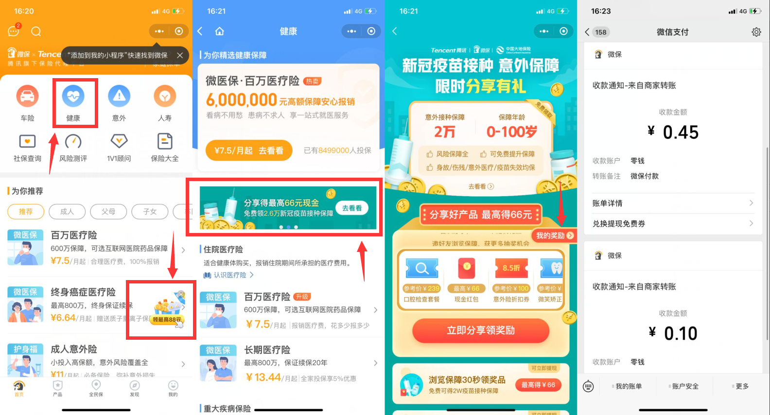 【微保领0.5~1元红包】微信小程序搜索“腾讯微保”->首页->点右侧边盒子->进去拆了红包->直接点查看奖励->然后提现0.5元->返回首页->健康->点中间轮播图->绿色图片 分享领最高->进来随便分享下->再点下面浏览->两个任务完成后->我的奖励->现金奖励->手动提现!