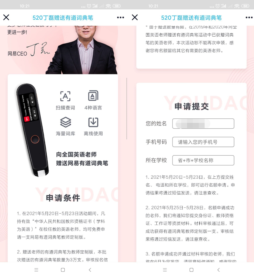 均可免费申请一支网易有道词典教师定制版,共赠送3万支