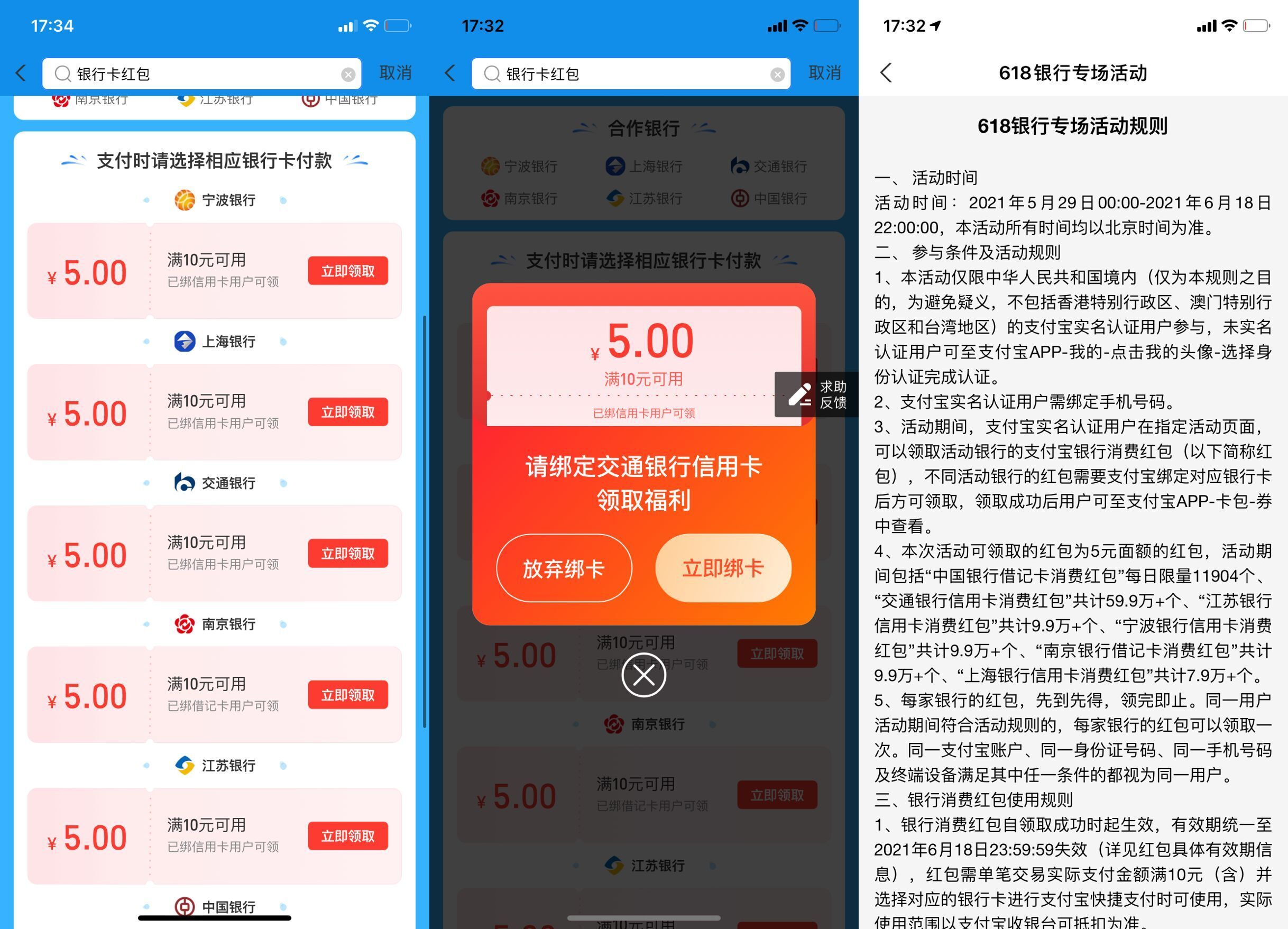 【领5元通用消费红包】新一期!打开支付宝搜索“银行卡红包”->看看有没有自己的卡->如果有直接领取即可!部分没有的话明天应该会补!