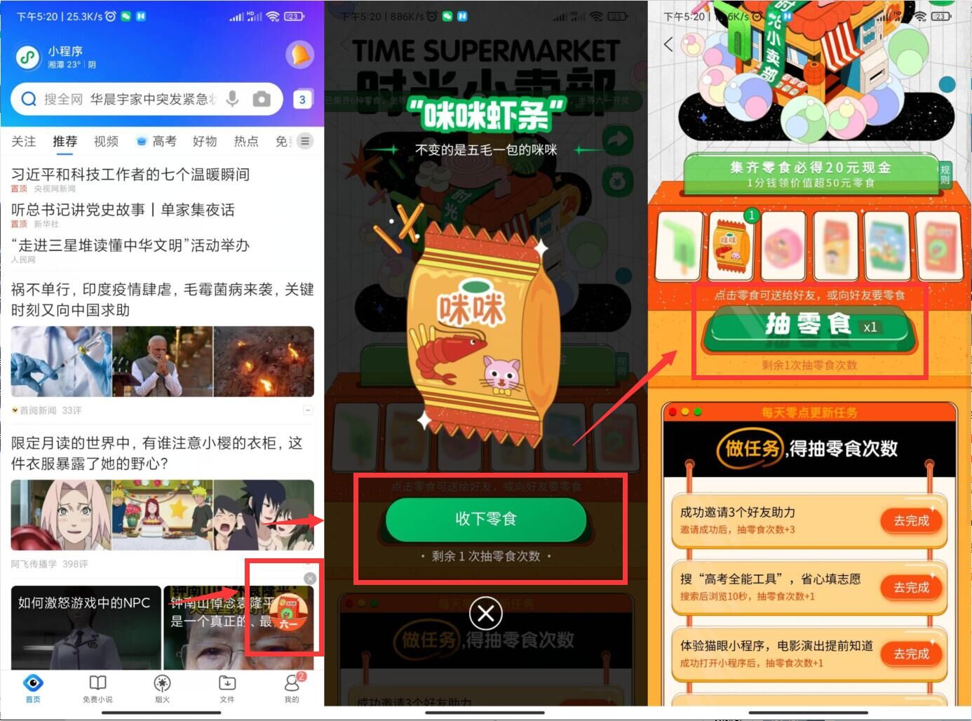 打开QQ浏览器首页右下“六一”进入完成任务抽卡->集齐6种不同零食卡领20元现金!