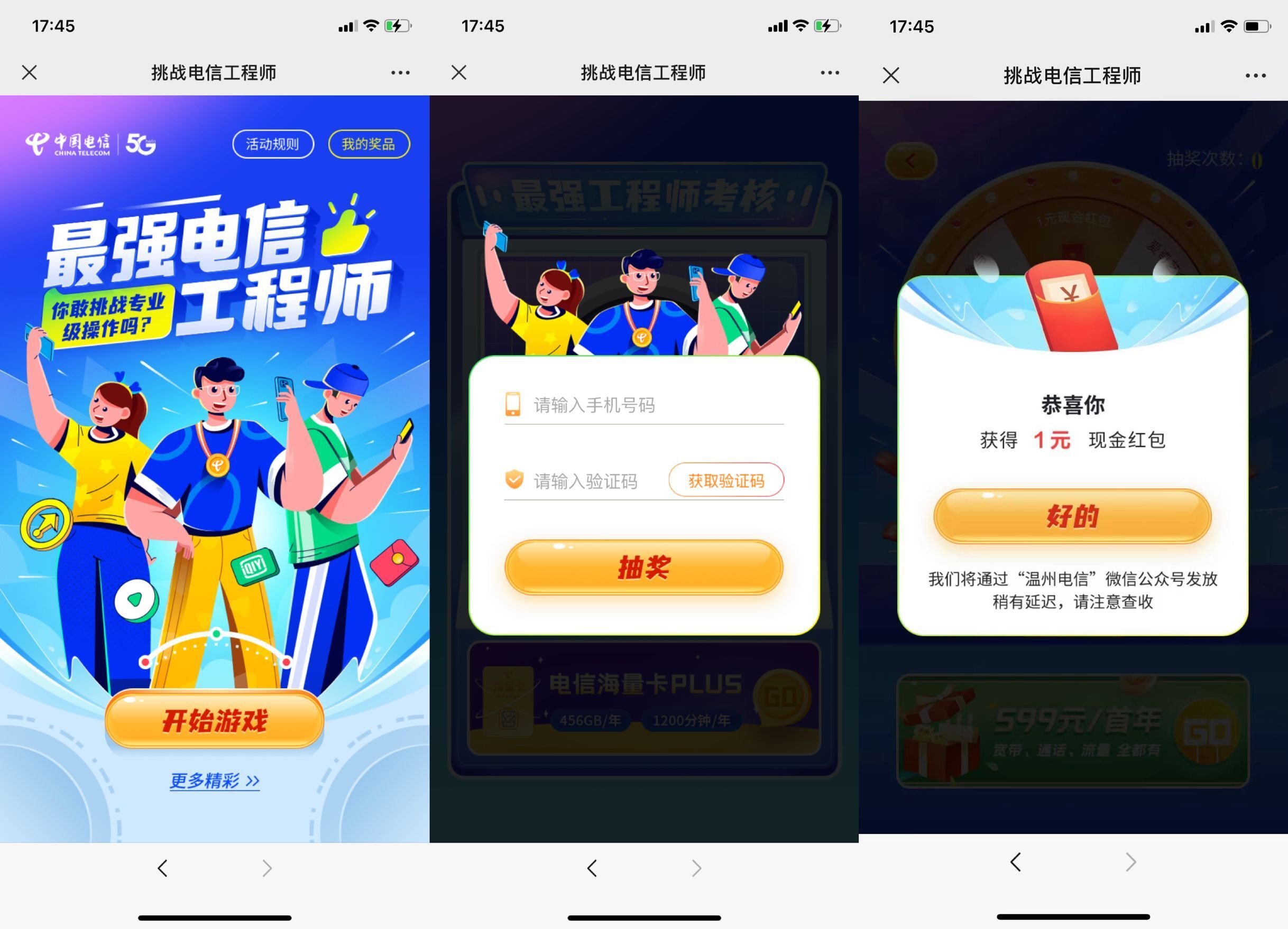 微信先关注“温州电信”公众号->在打开链接点图进去->简单玩游戏->登入抽奖!抽0.5~1元红包,不秒到。