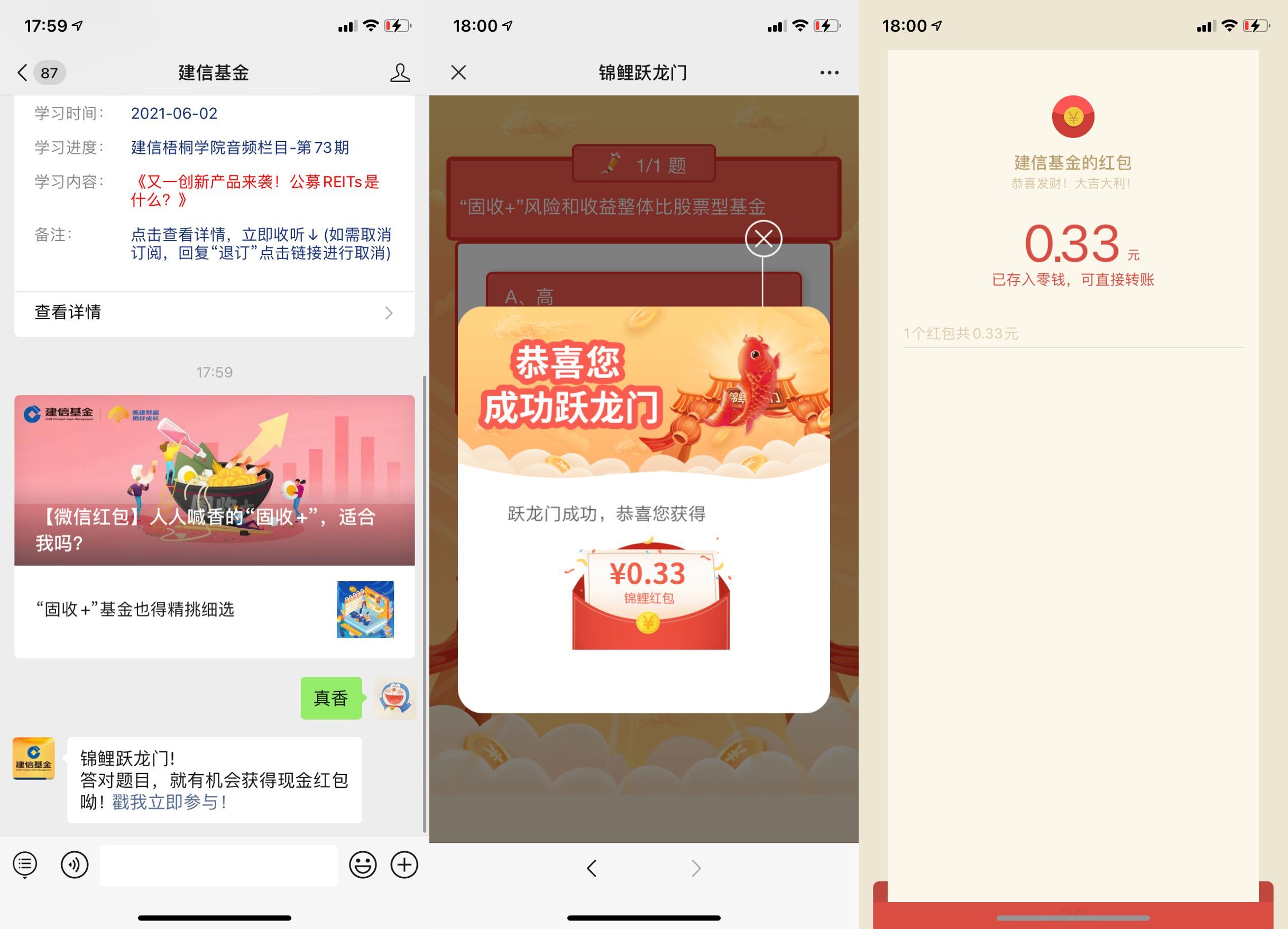 【建信基金抽红包】微信关注公众号“建信基金”->回复“真香”->点推文进入->简单答题选“低”抽->亲测0.33秒到!非必中!