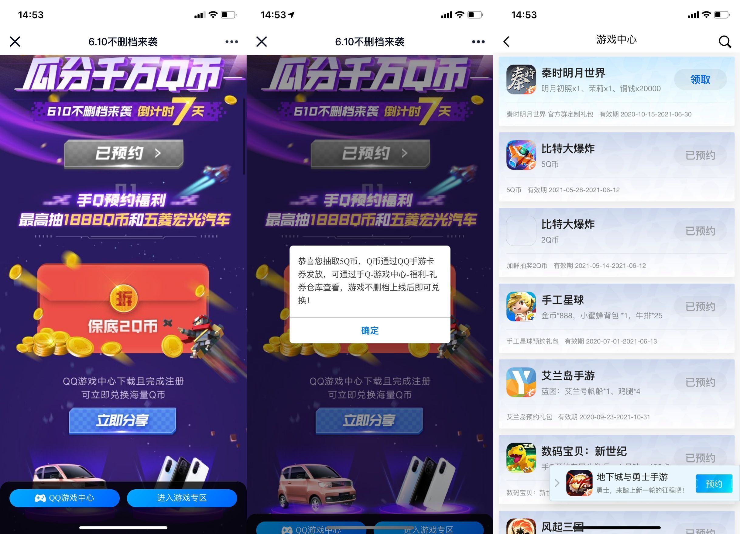活动恢复了!昨天没领到冲!比特大爆炸手游预约抽2~15QB->打开分享返回抽->中了要等游戏上线才可以兑换!
