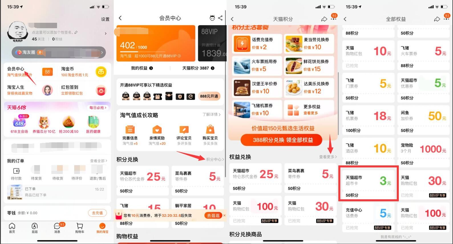 【淘宝50积分兑换3元猫超卡】打开淘宝APP->我的淘宝,会员中心->积分中心进入->找到权益中心点更多->下拉如图所示找到兑换即可。
