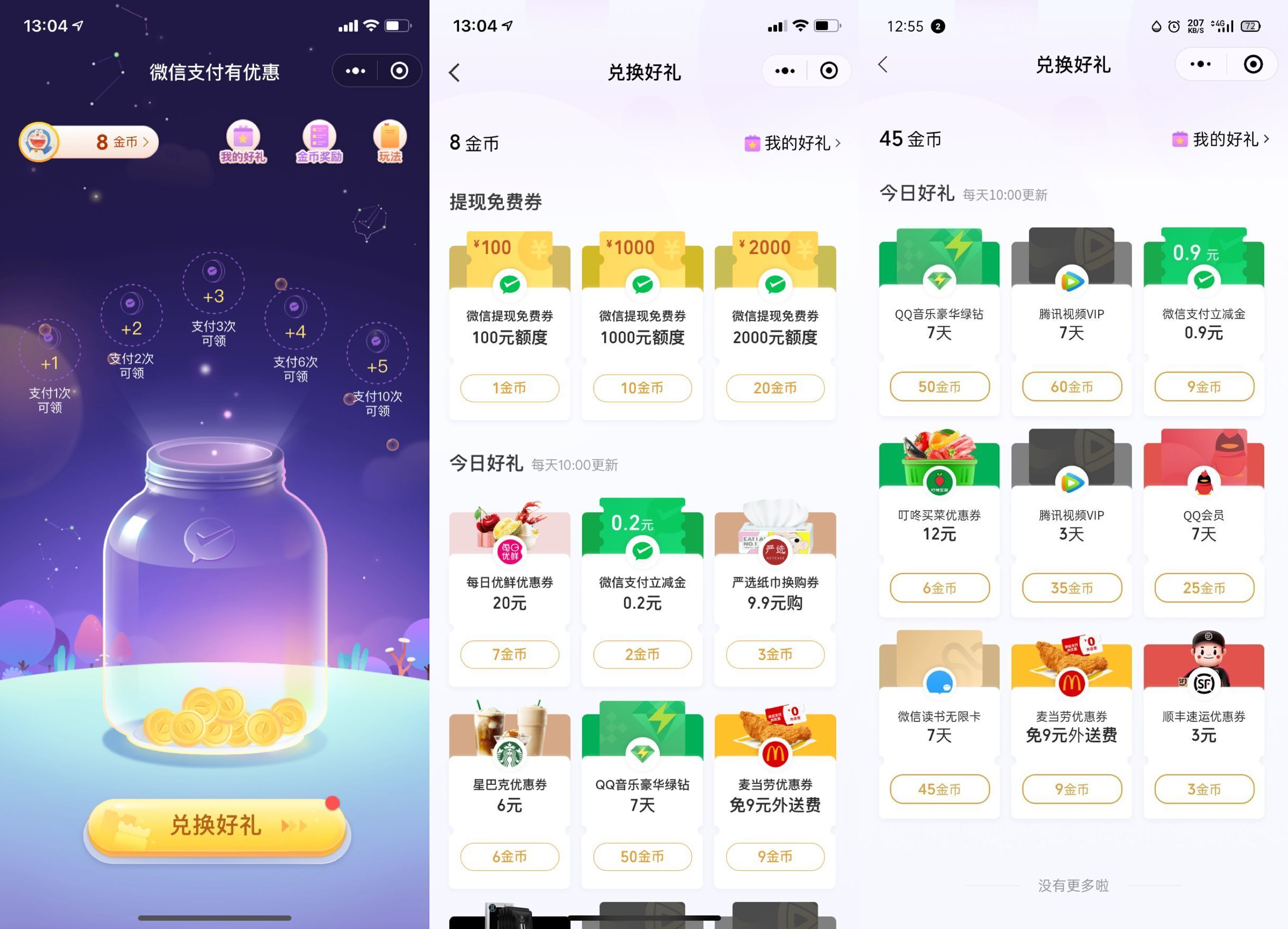 微信小程序“微信支付有优惠”->点底部金币换好礼->可兑换体现免手续费券、或7天QQ会员等等!经常使用微信支付的可以看看。