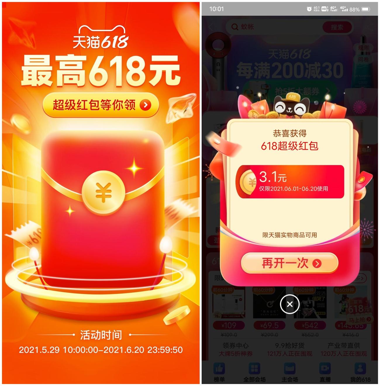 1、天猫618抽红包提前开启了->活动时间内每天都可以抽->红包可以无门槛叠加使用