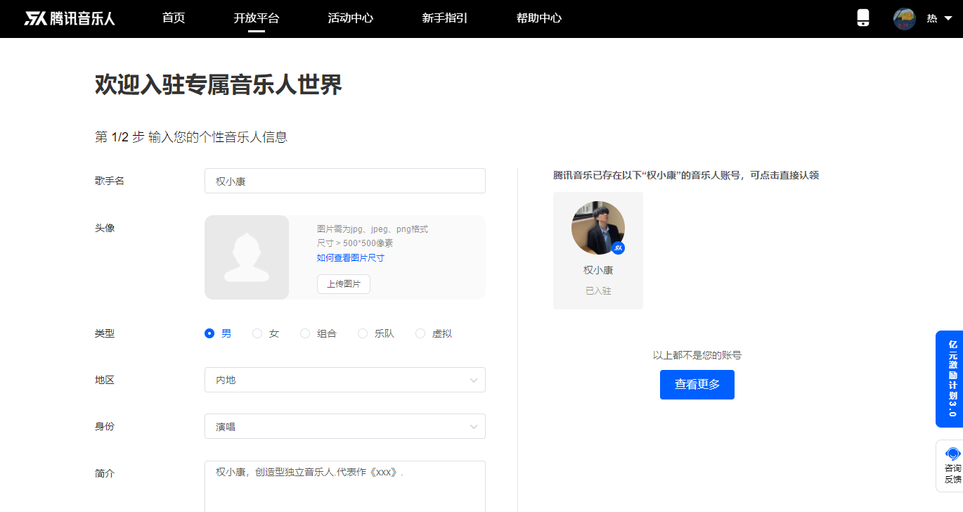 点击立即入驻音乐人资料如实填写歌手名,简介,头像这都不必在意后期可以改,