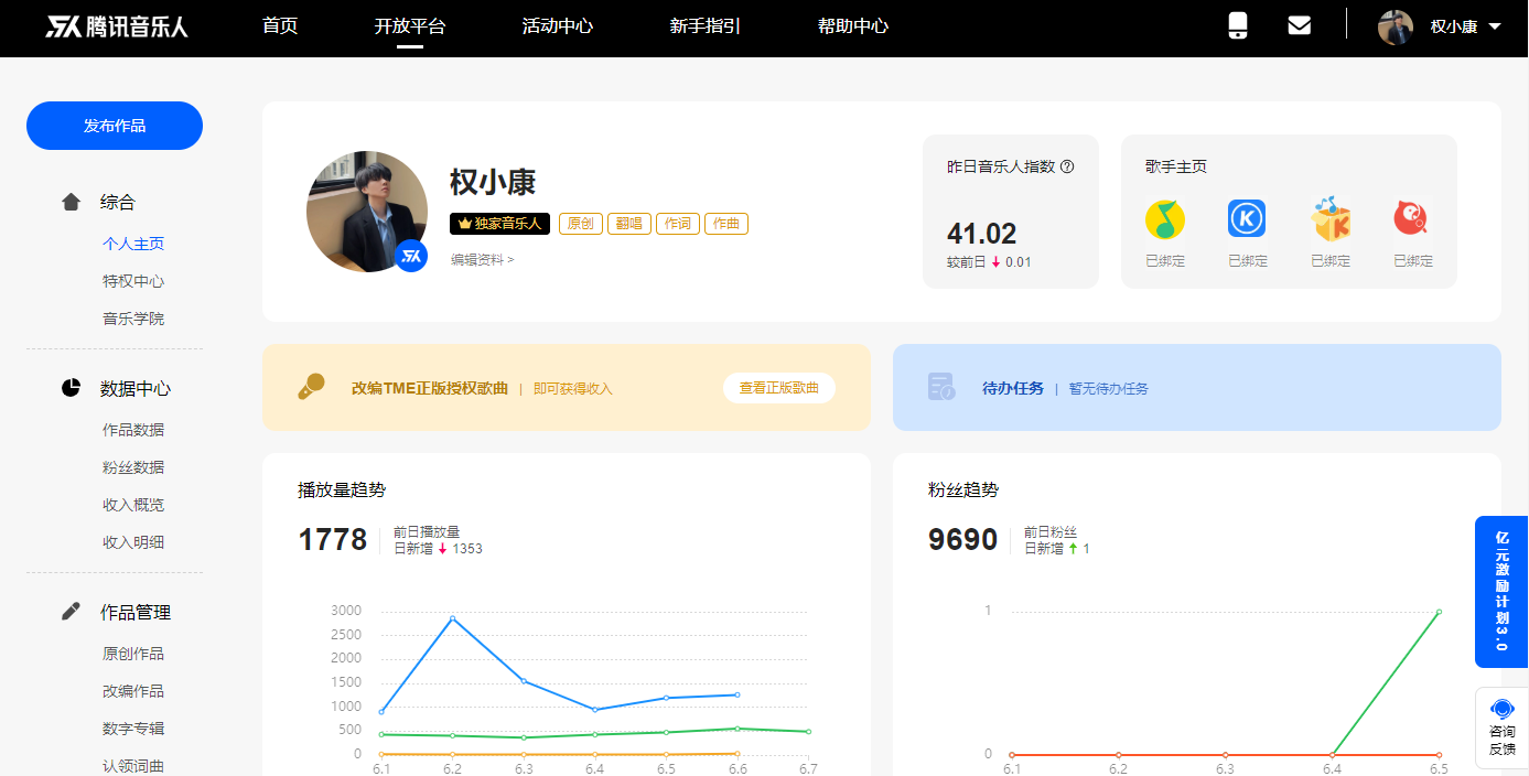 大家好,我是权小康。 今天给大家带来腾讯音乐人手把手教程.... 因为我已经入驻了 用小号给大家演示一下 话不多说
