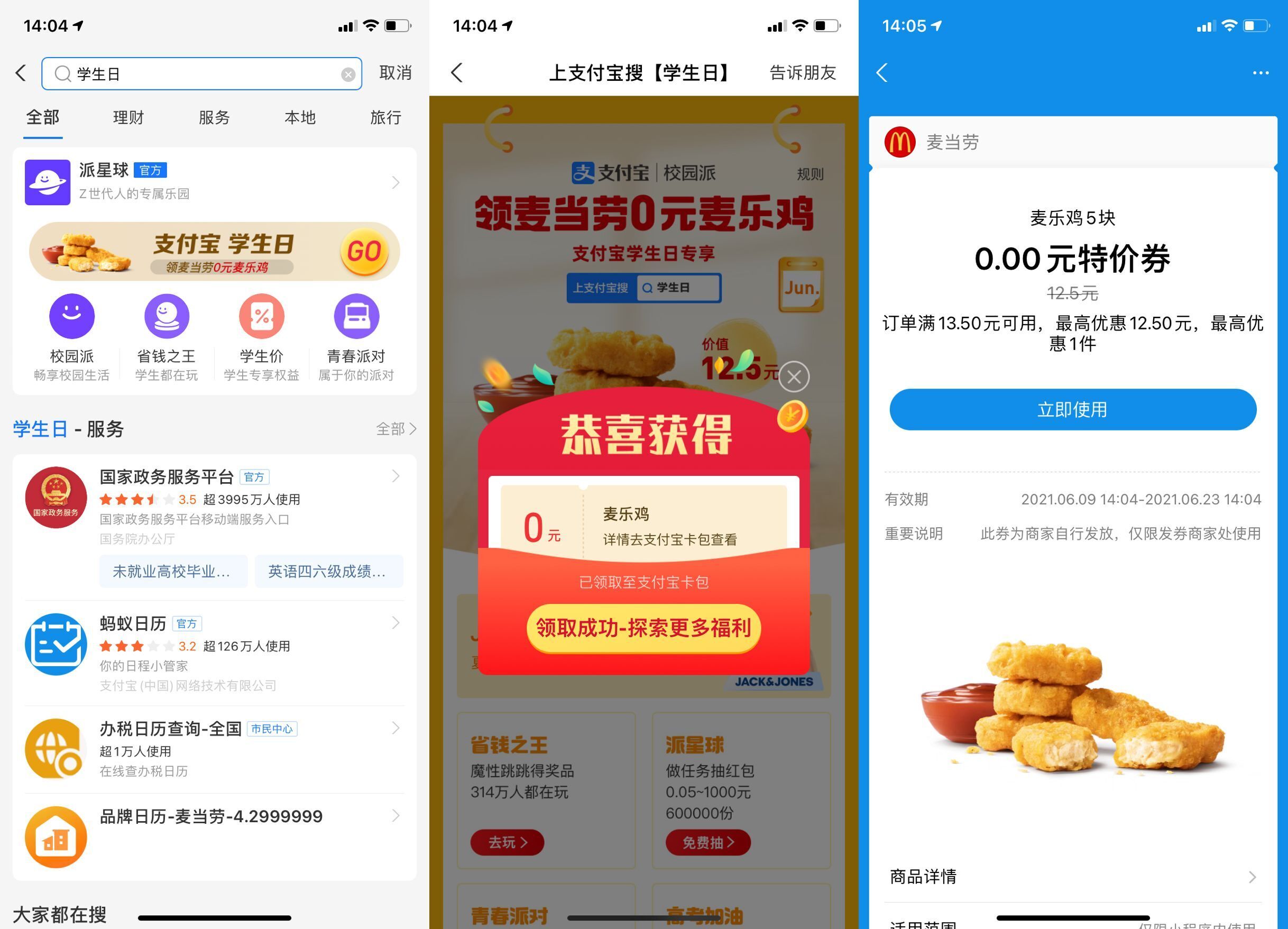 【免费吃麦当劳麦乐鸡5块】打开支付宝App搜索“学生日”->点横幅进直接领->路过可以点份冰淇淋顺带上~