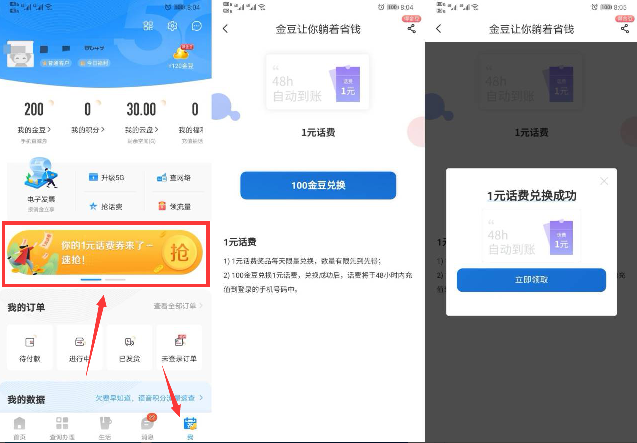 【电信部分用户领1元话费】打开电信APP->我->中间轮播图看有没有“你的1元话费券来了”->没有说明没资格->有就进去兑换秒到->没金豆右上角签到一下!
