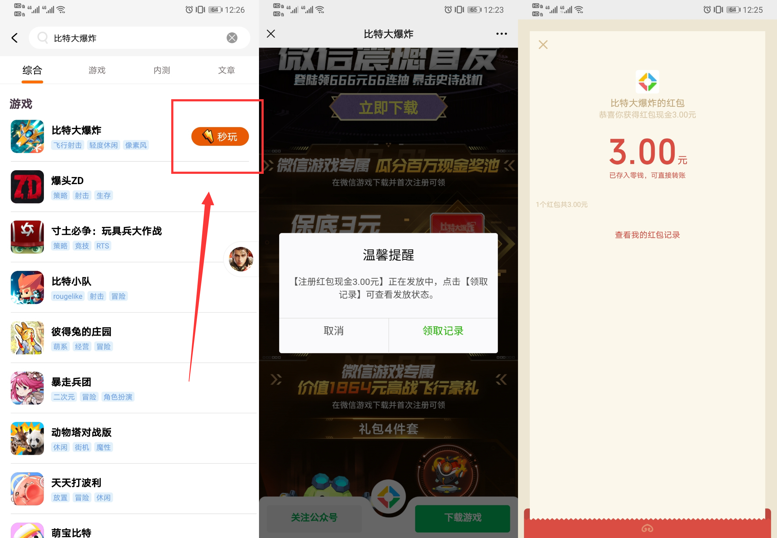 【比特大爆炸必中3元红包】限安卓!各大应用市场下载“先游”app->搜索“比特大爆炸”->微信登录 注册角色->微信打开链接领取即可!亲测3元秒到!