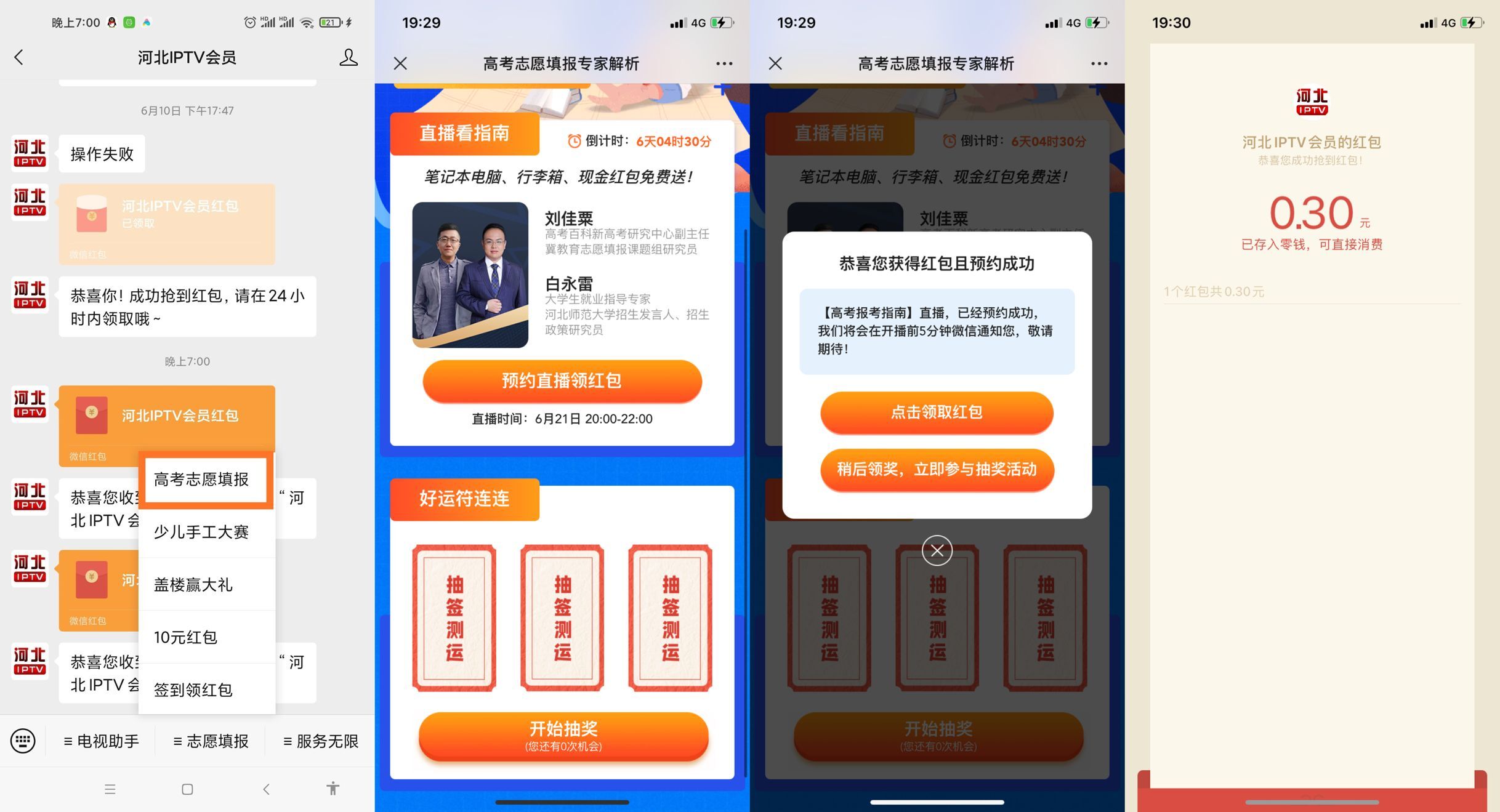 微信关注“河北IPTV会员”->点中间菜单栏->高考志愿填报->进去预约领一次->下面还可以抽一次->抽中后点奖品兑换!群友亲测。