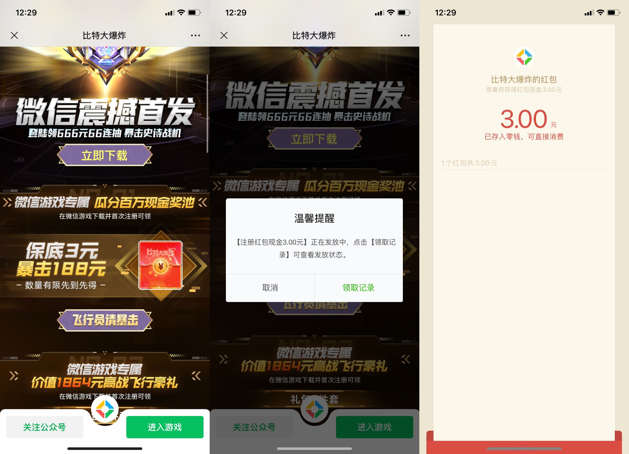 【比特大爆炸新用户领3元】不需要下载游戏,安卓的搜索下载先游APP->然后搜索“比特大爆炸”->秒玩->微信登录进下大区就行了->然后微信打开链接领红包!苹果的就要下载游戏。