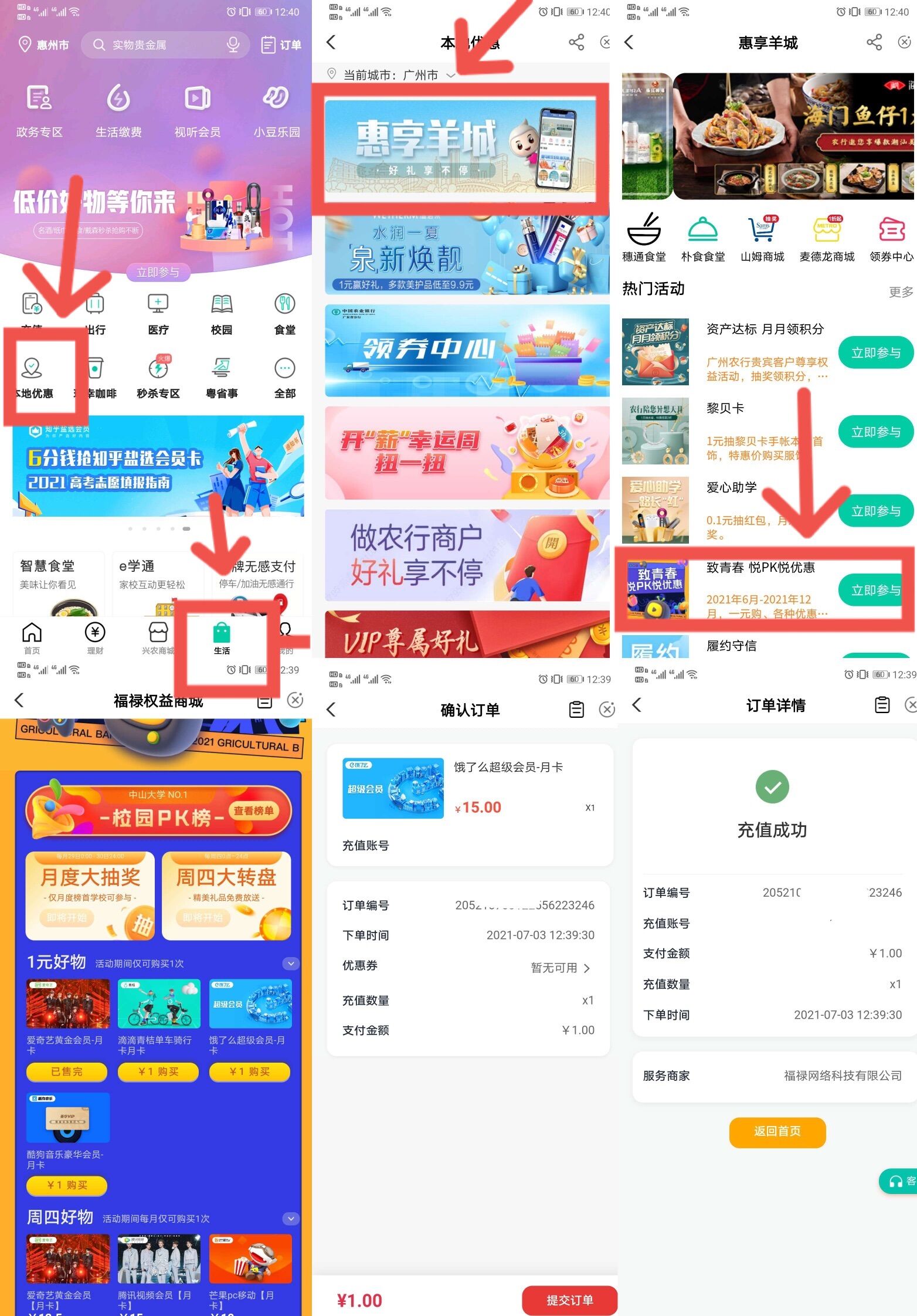 【农行1元开青桔饿了么酷狗月卡】不限地区!打开农行APP->底部生活->本地优惠->城市改成广东-广州->点惠享羊城进入->进来下拉页面点致青春->随便点个大学就会出现购买页面->3选1刚需速上!自己不需要懂接单的可以自己去卖卖~