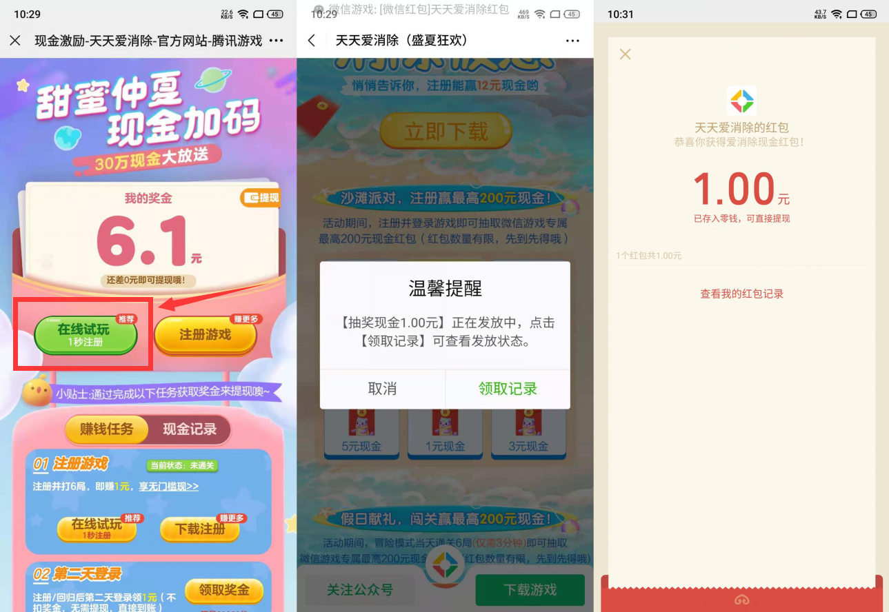 【天天爱消除新用户领1元红包】微信打开第一个链接->点在线试玩(要等会)->登入失败不用管!->打开第二链接->直接抽!亲测中1元微信红包!老用户貌似不能领。
