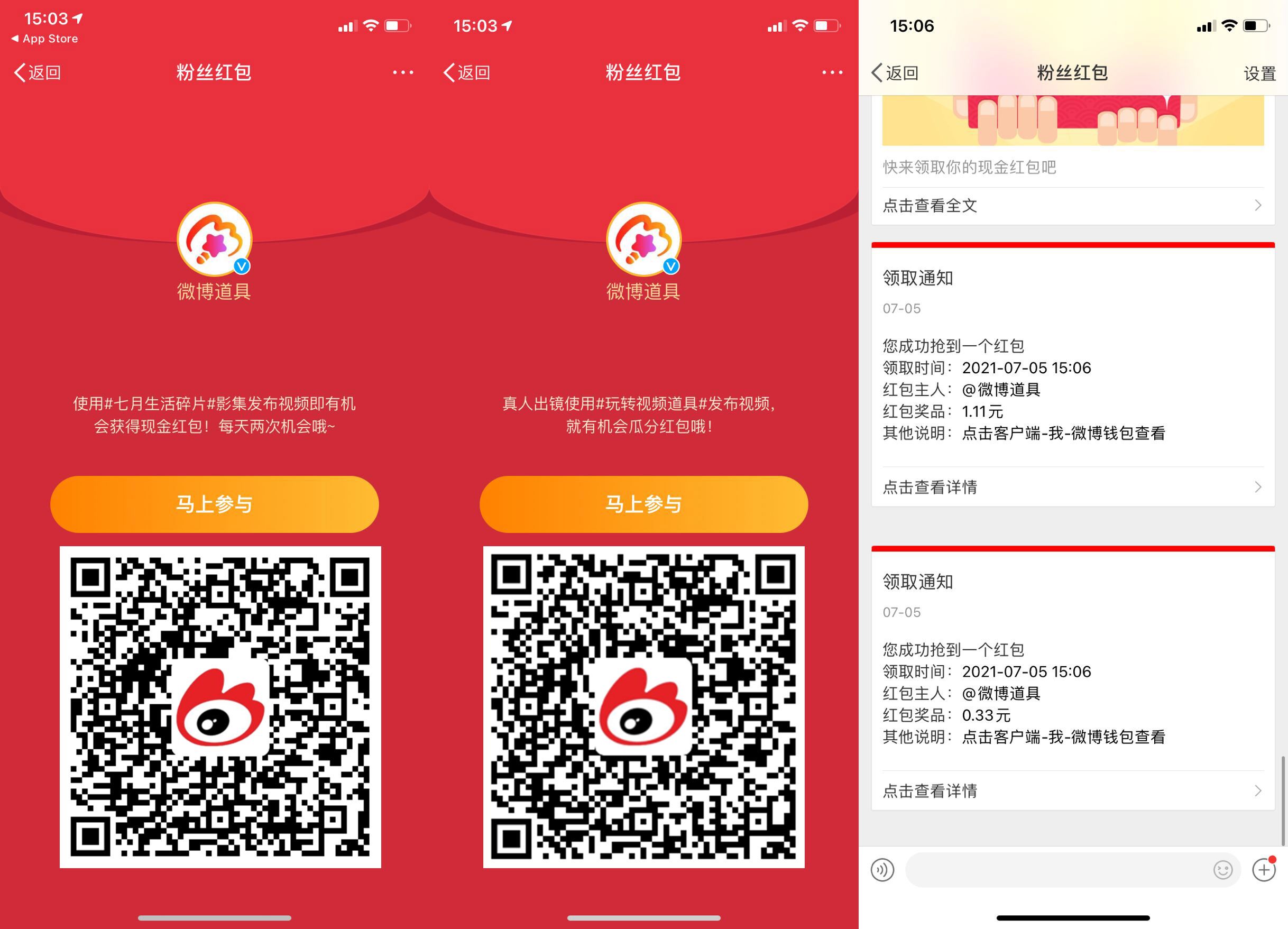 【微博抽0.5~2元红包】打开微博APP->我->右上角扫码进入活动->依次参加即可->按照提示随便发微博(2个活动各发2次,第二个活动需要真人出境)->发完后没提示->直接去消息拆开4次红包!去钱包提现即可~