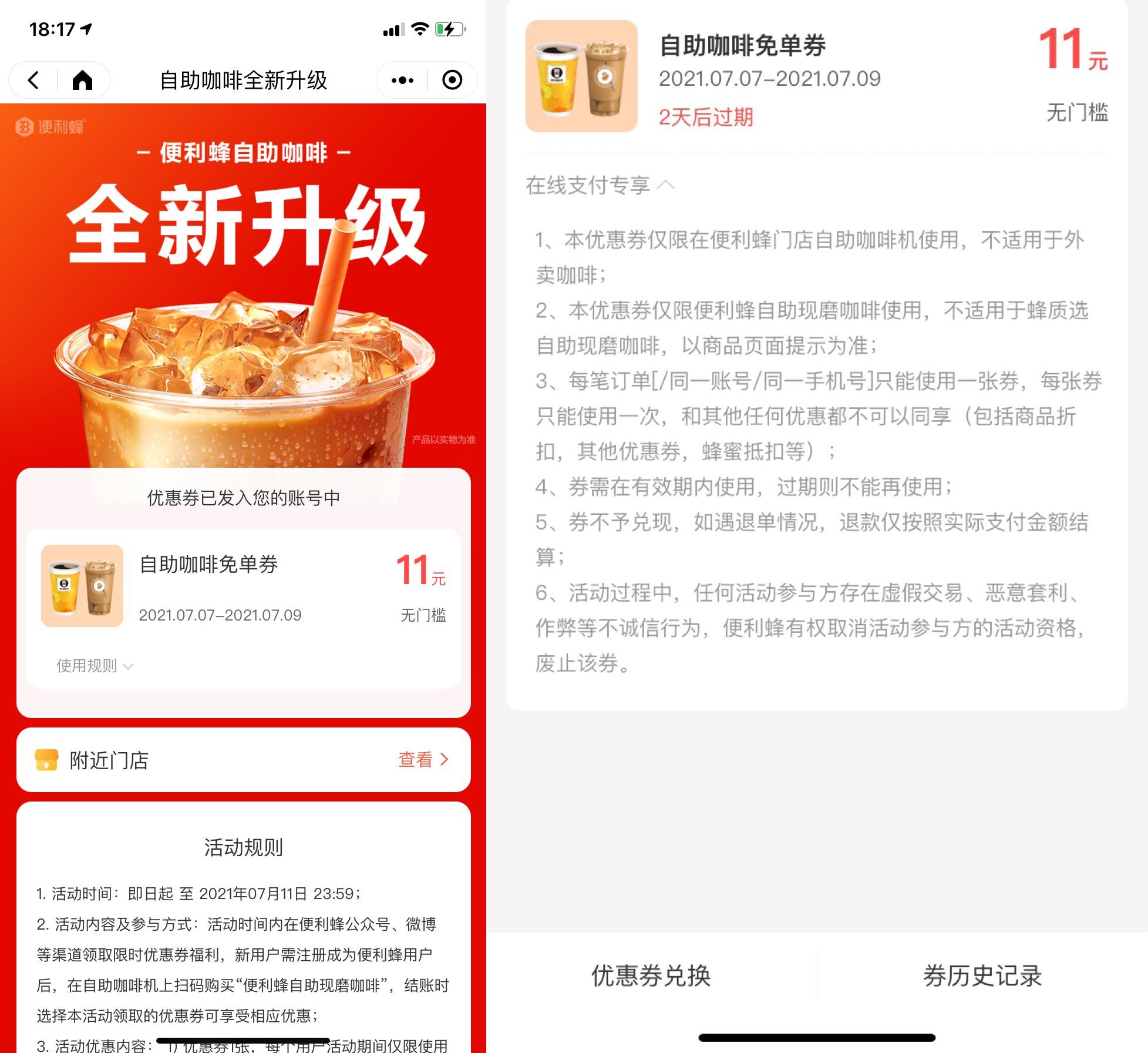 【免费领便利蜂自助咖啡免单券】微信打开链接->可在小程序领取1张免费咖啡券->在门店自助咖啡机上可使用即可!身边有店的可以领一手。