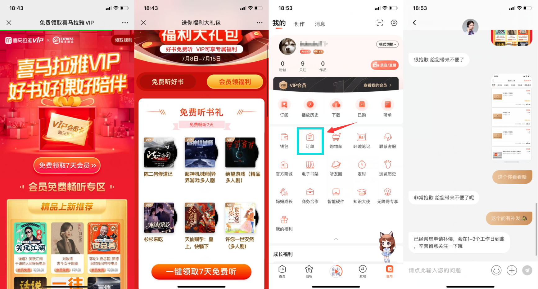 【喜马拉雅领7天会员+好书】喜欢听书听电台的领一手!7天会员部分老用户领了不会到账,不到账去我的订单找到被退款的截图给人工客服!能补发->7天好书都可以领->领了后然后去账号->订阅->查看!