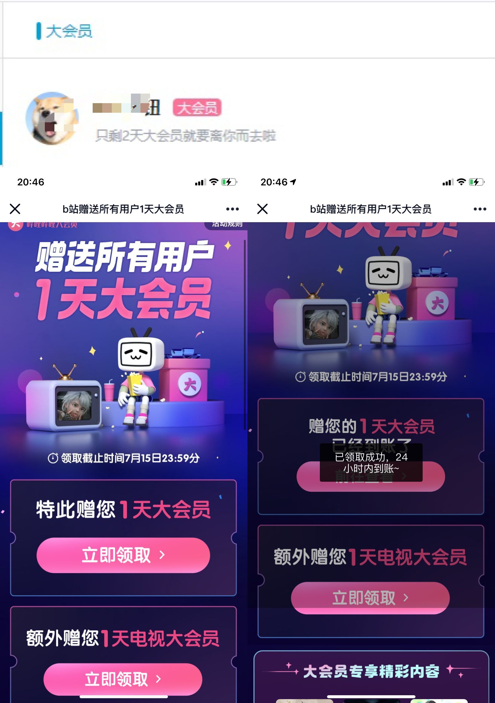 【B站老用户免费领1天大会员】昨晚B站崩了,所以今天向所有老用户免费送1天大会员+1天电视大会员,手机打开领取即可!