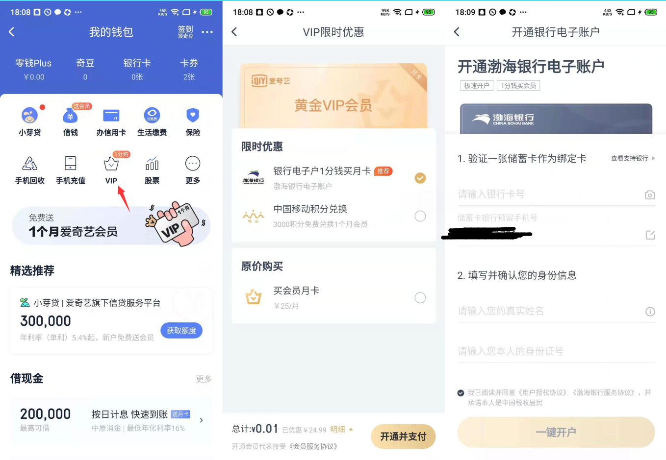 【安卓用户0.01元开通爱奇艺月卡】打开爱奇艺APP->我的钱包->vip->需要开户按要求操作即可->介意的别上!