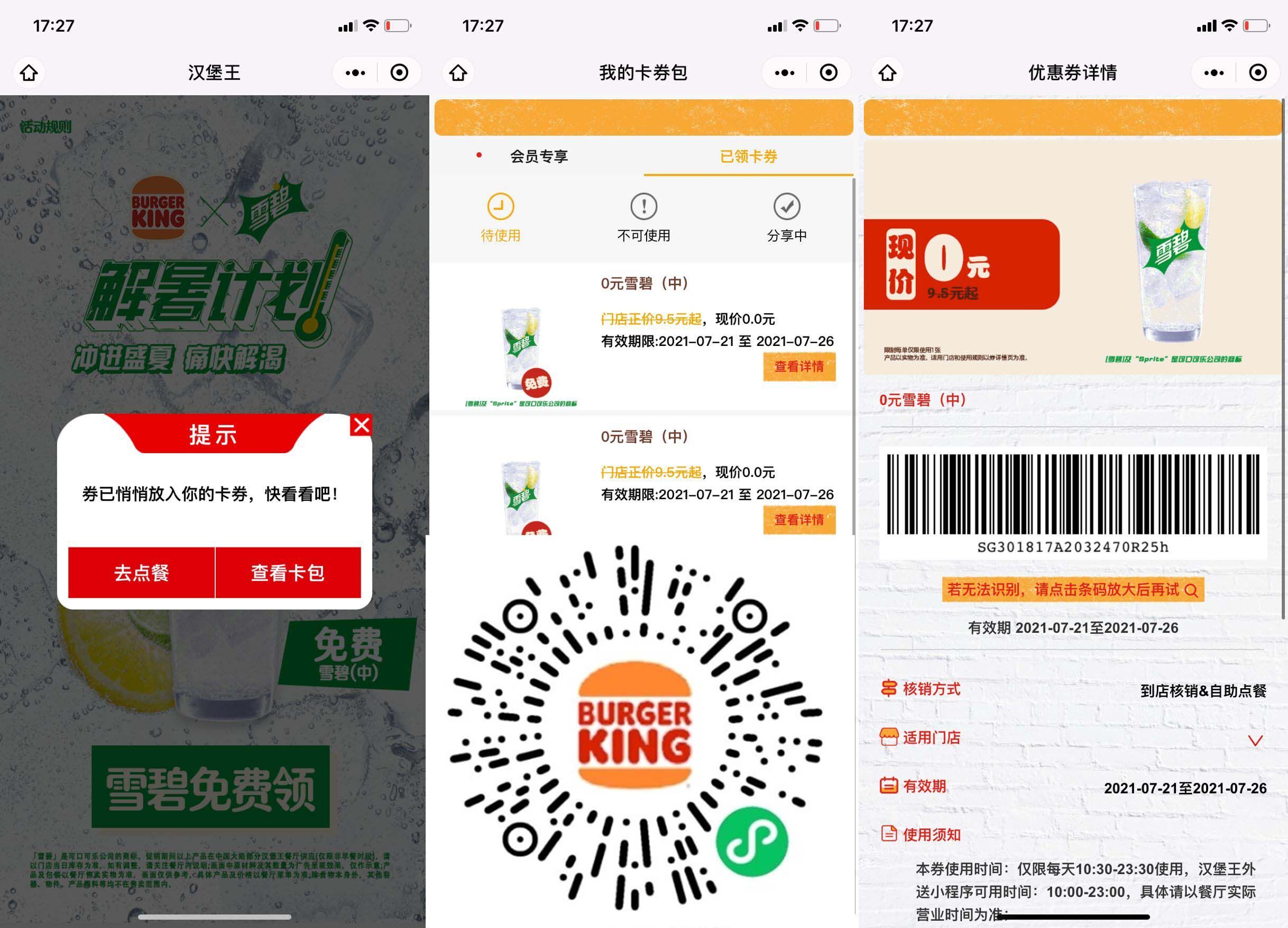 【汉堡王免费领两杯中杯雪碧】附近有汉堡王的上!微信扫码点击领取(能领两次)->领了后在小程序“汉堡王+”->我的卡包即可看见->有效期7天!应该不用额外消费!直接就能用!