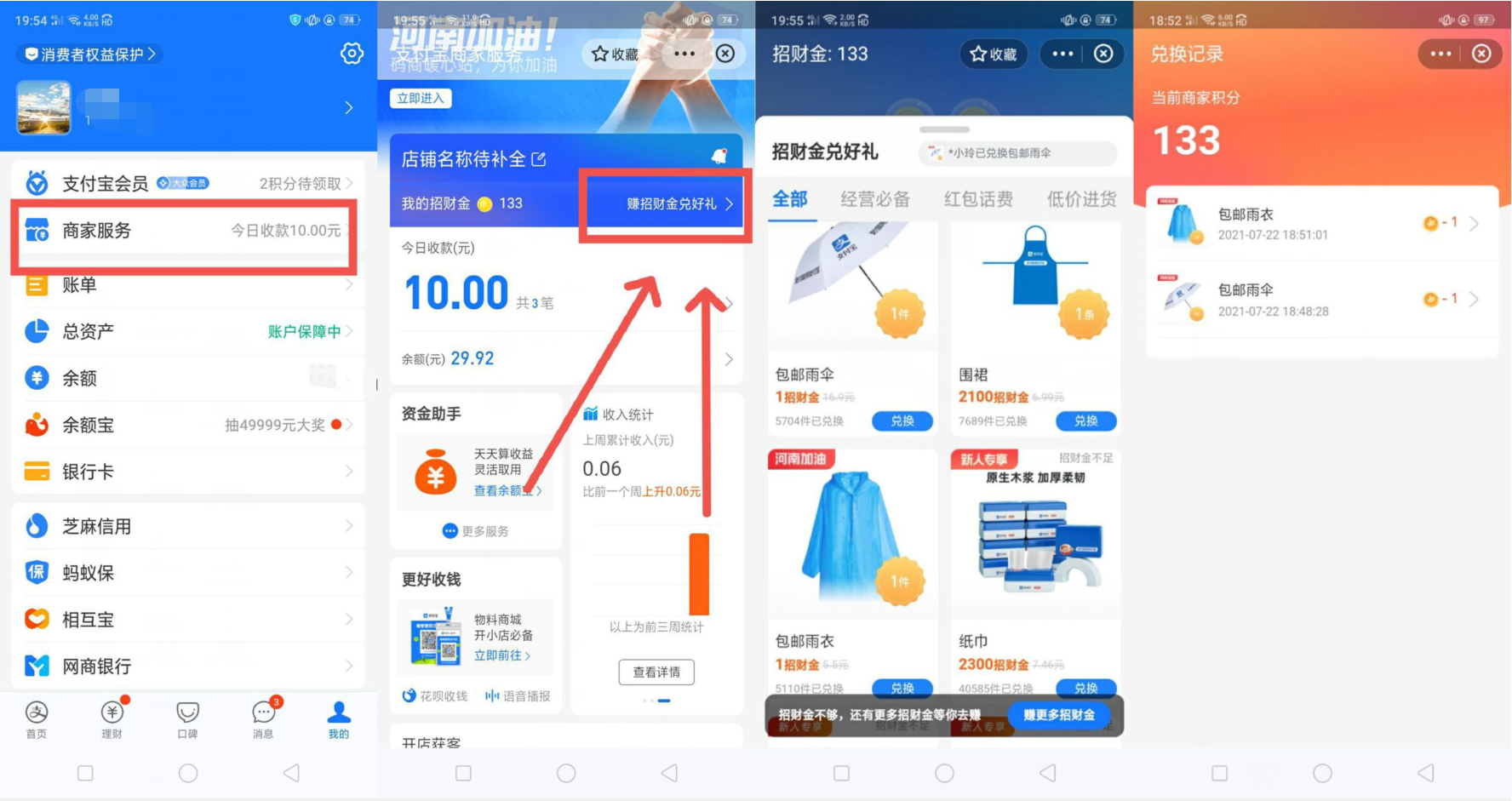 【支付宝部分用户领雨伞雨衣】支付宝搜索“收钱有奖”->进去后看见有1积分换雨伞、雨衣就兑换!不会就如图操作(限河南地区参加,不需要可转发)活动2:支付宝搜索“收钱得红包”->点横幅进活动->有资格就按照提示做可领10元红包(全国部分用户可参加)