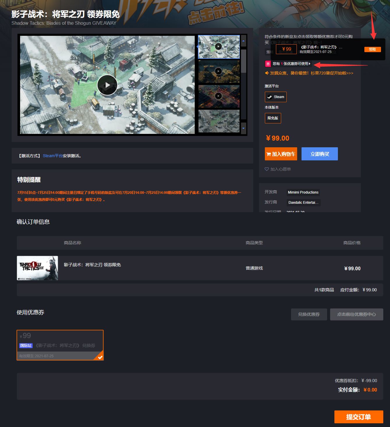 【Steam喜+1】免费领电脑游戏《影子战术:将军之刃》,复制链接电脑端打开!如图操作先在杉果平台领取券后0元下单得到激活码,再去Steam平台兑换即可!不会兑换的百度一下。