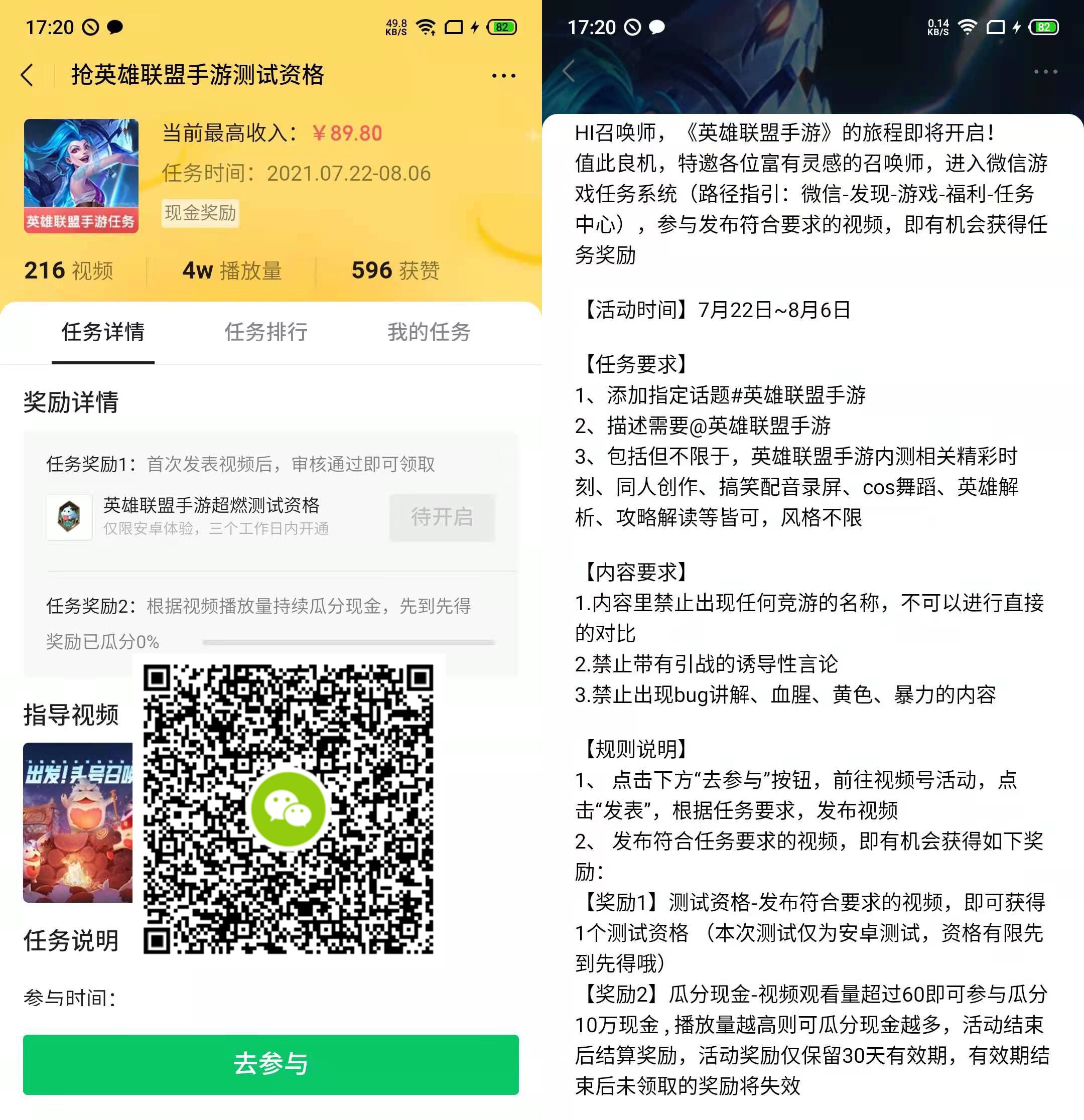 【微信抢英雄联盟手游测试资格】限安卓!微信扫码参加->按照提示发布符合任务要求的视频->审核通过后即可获得手游测试资格(数量有限)->另外视频播放量达到60即可瓜分随机微信红包!