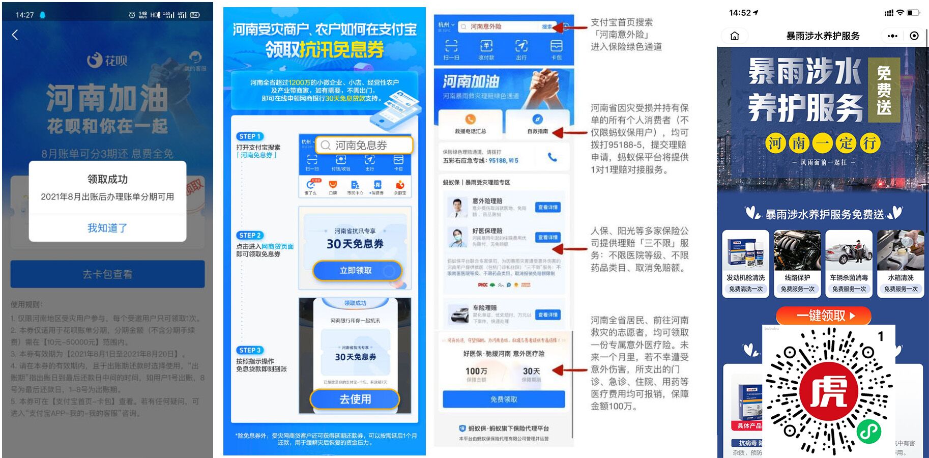 【河南地区用户领支付宝免息】支付宝搜索“河南免息券”、“河南意外险”、“河南花呗免息”权益->进入活动页面按照提示领取即可!=====【河南地区领途虎汽车养护服务】微信扫最后二维码领取即可,用不上可转发,河南一定行!