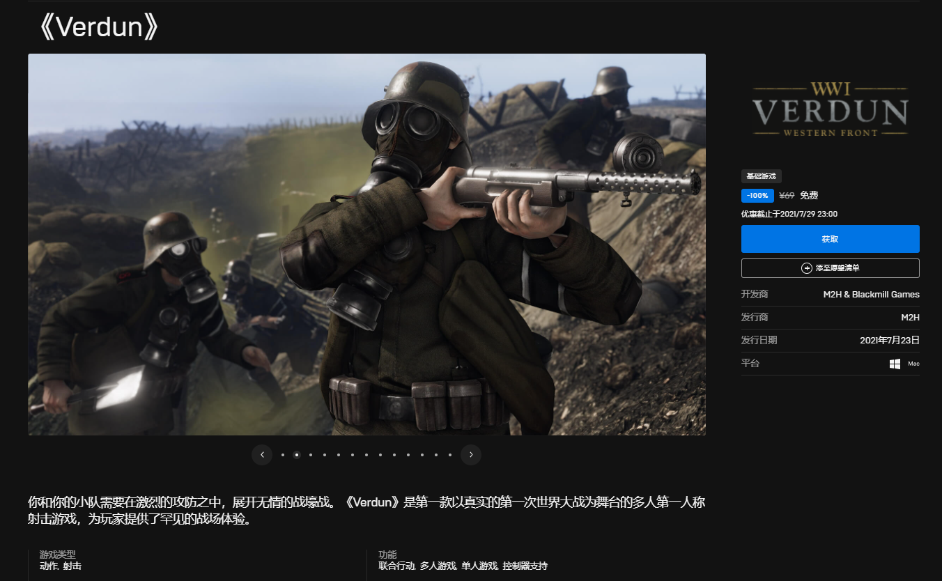 Epic喜+3免费领《凡尔登战役》《防御阵型:觉醒》《星际战甲》