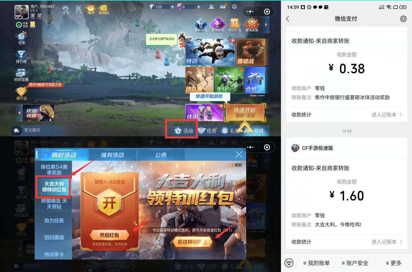 【穿越火线枪战王者领1~5元红包】微信小程序搜索“穿越火线枪战王者”->点进来后点右下角活动->大吉大利领特训红包->前往特练模式赢一把->然后返回领红包即可!秒到的