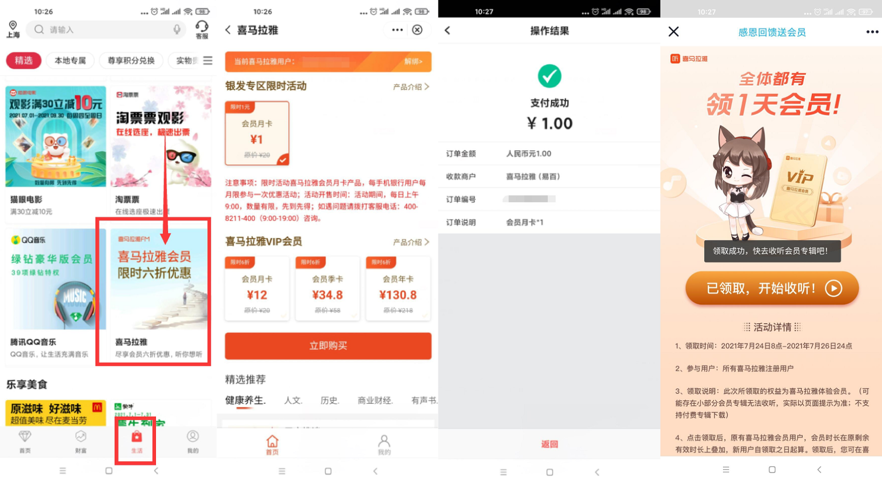 【中国银行1元开喜马拉雅会员月卡】打开中国银行APP->生活->下拉页面找到“乐享视听”->再下滑找到喜马拉雅会员->点进去显示1元就开通———【免费领取1天喜马拉雅会员】所有用户都可以直接领到!