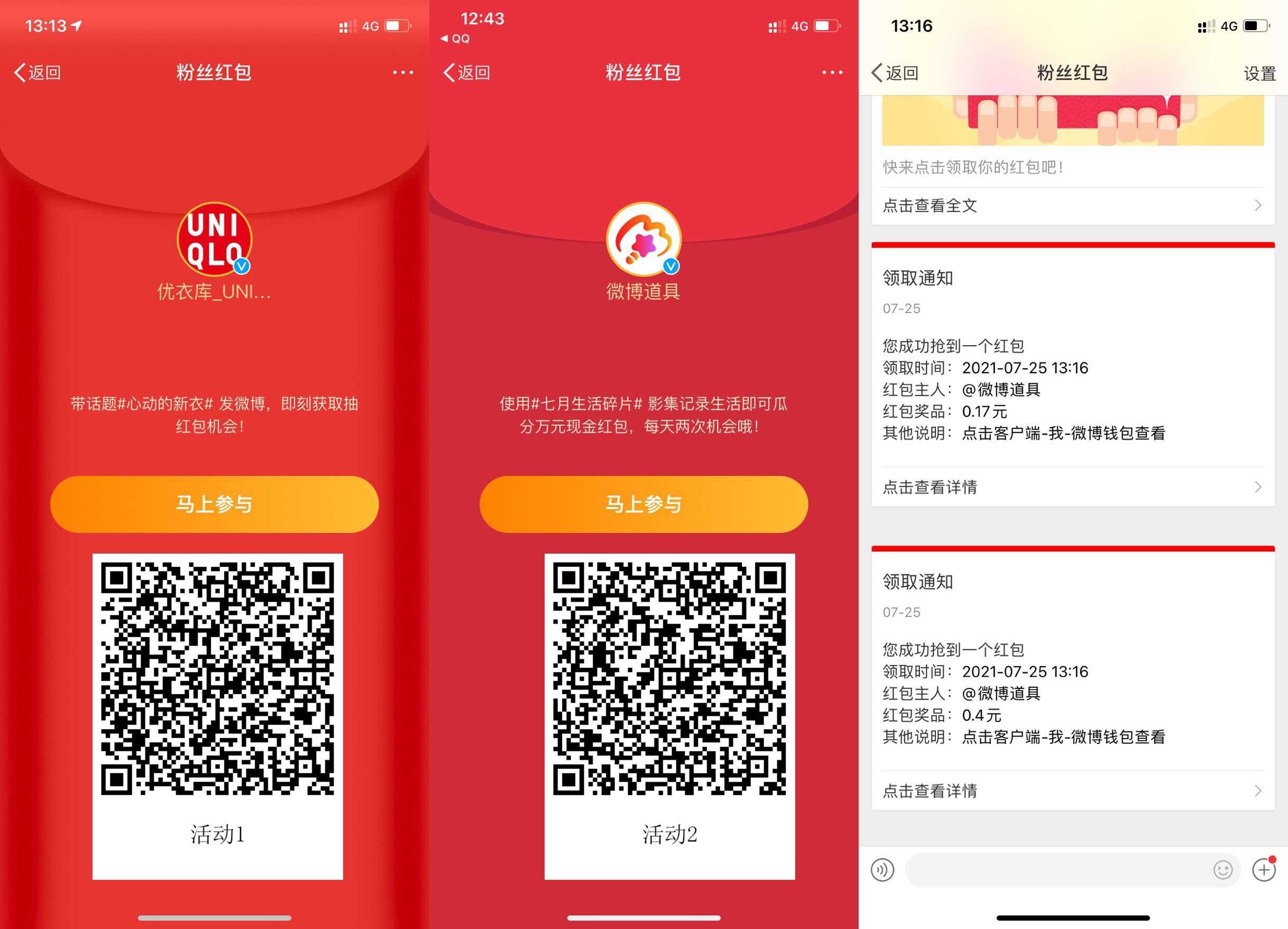 【微博抽1~3元红包】打开微博APP->我->右上角扫码进入->按照提示发微博活动1发一次->活动2发两次->发完后没提示去消息里拆开3个红包!
