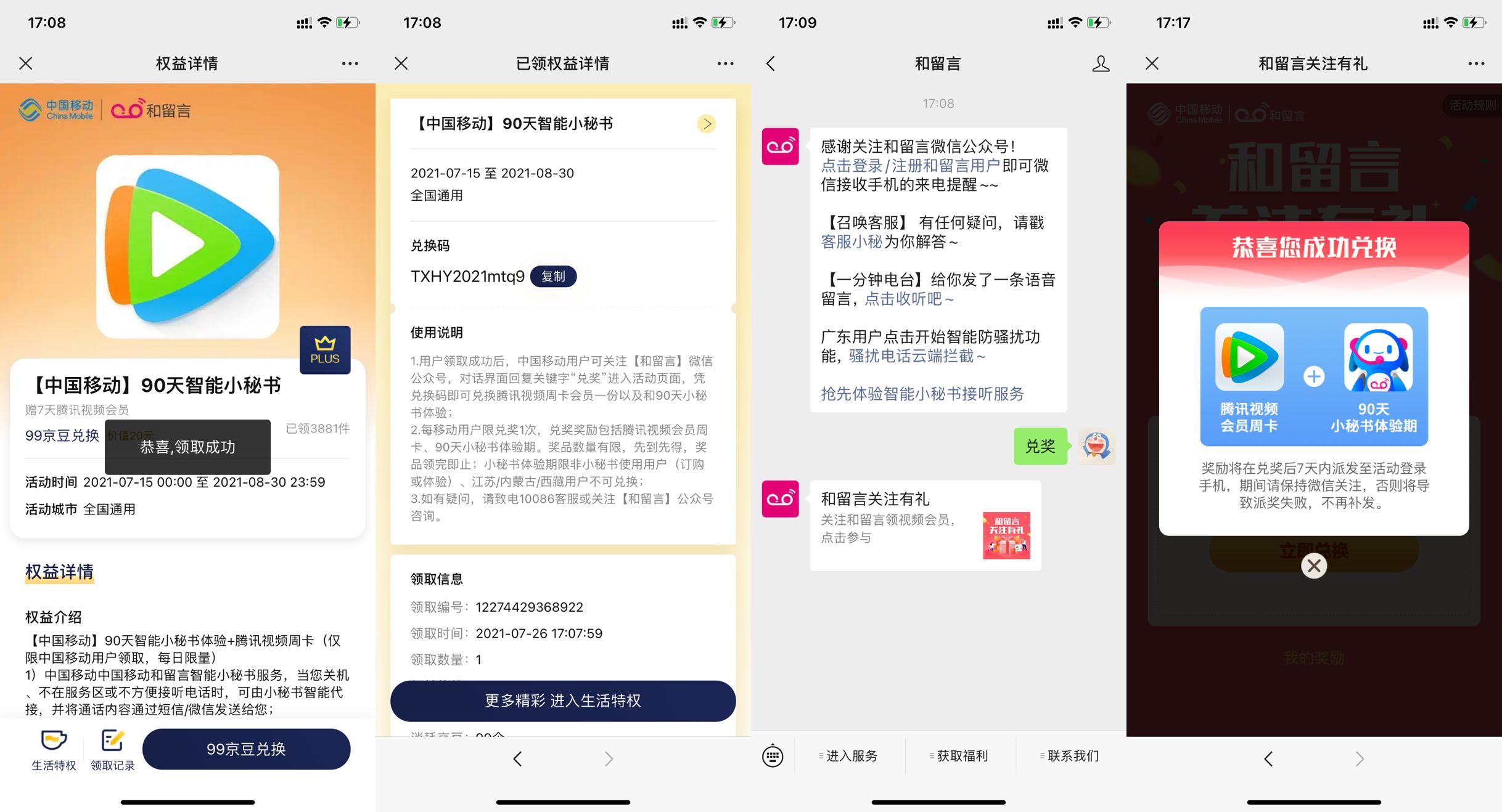 【京东会员领7天腾讯视频会员】限京东会员参加!打开地址用99京豆兑换->然后复制兑换码->微信关注“和留言”->发送兑奖->点推文进去兑换激活即可!只能给移动手机兑换->7天内到账!