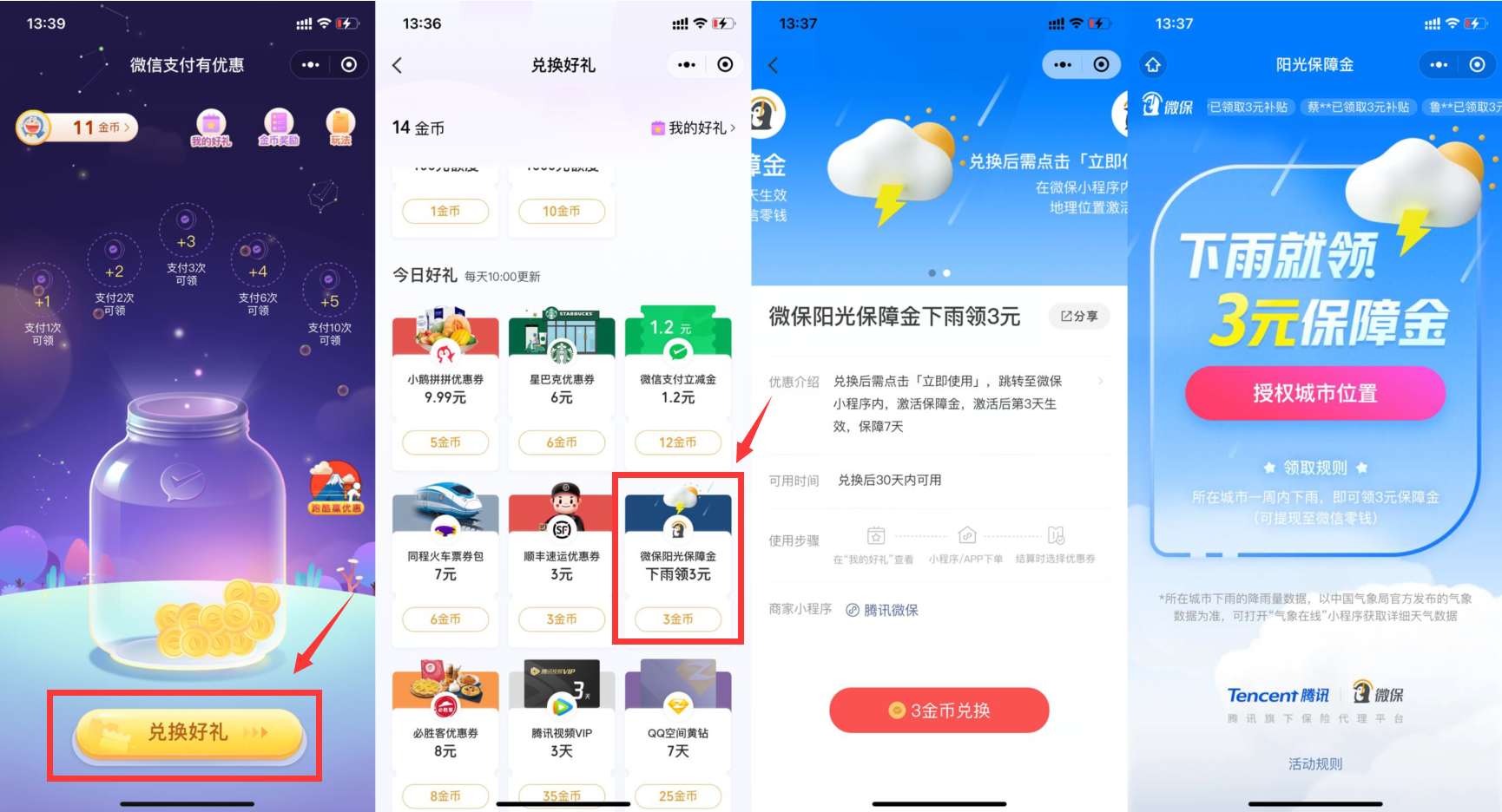 微信小程序“微信支付有优惠”->点底部兑换好礼->看看有没有“下雨领3元” 这个选项->有就用3个金币兑换,一周内你的城市下雨可以领3元可提现至零钱。有的 话可以去玩玩看!