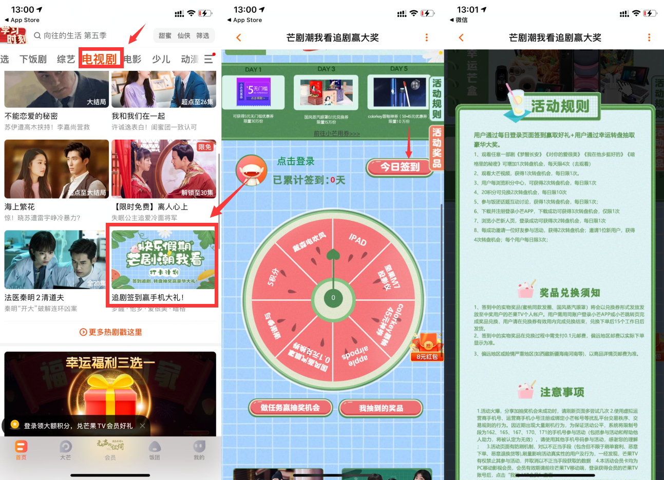 【芒果TV签到领蒸汽眼罩】打开手机芒果->首页顶部左滑到电视剧->如图点下面右侧边追剧签到->下拉页面签到第一天的券没用无视->签到3天可获得1盒蒸汽眼罩(5片)->签到7天可获得少女小清新发圈->都是包邮的。