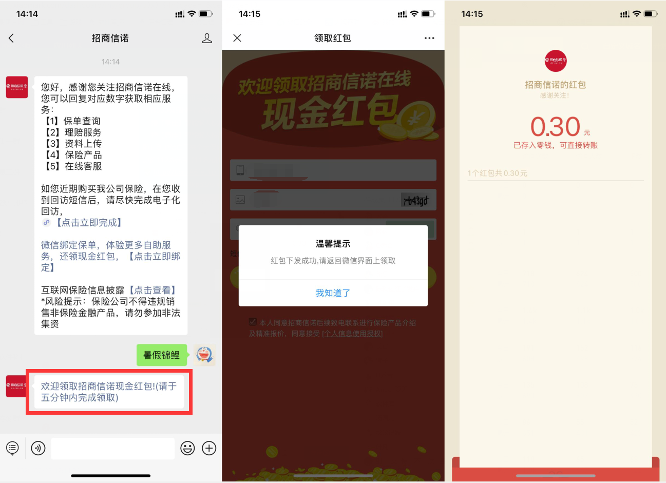 微信关注“招商信诺”->回复“暑假锦鲤”->点推文进入->亲测0.30元微信红包!多号多撸人人有份!
